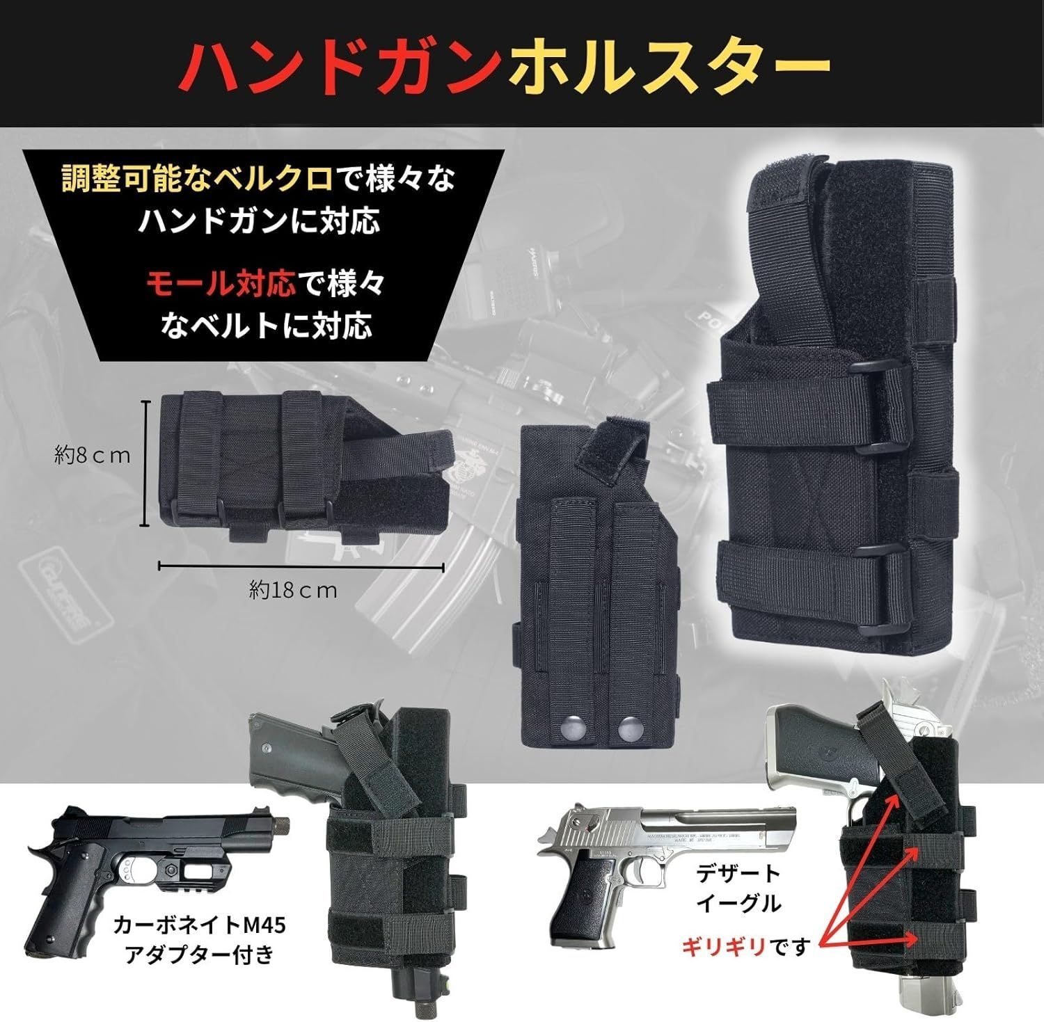 【ホルスター】 直線構造で操作性に優れたナイロンホルスター。可変式ウェビングベルトにより、機種を問わず安定した保持が可能です。