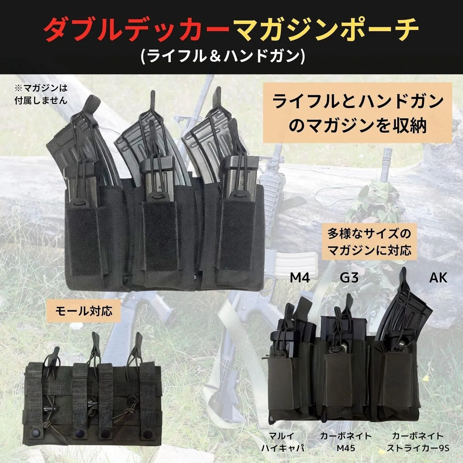 【ダブルデッカーマガジンポーチ】 オープントップ式で取り出しやすい、3連カンガルータイプ(ダブルデッカー) マガジンポーチです。M4、AK、G3、M14、89式用マガジンなどのマガジン3本とハンドガンマガジン3本を収納可能。 入荷時期により、商品の仕様(パッケージ、容器、デザイン、サイズ、カラー、素材、表記など)が変更する場合があります。生産時期により色、細部が変更になる場合がありますご了承ください。モニターや光の加減で実際の見え方と違う場合があります。金属アレルギーの方はご購入をお控えください。ボタンの摺動抵抗には個体差があります。製造時、輸送時における、使用に差支えのない傷や変形がある場合があります。製品の検品の際の開封や箱の痛みのある場合があります。小さな部品があります。口の中には絶対に入れないでください。窒息などの危険があります。小さなお子様やペットの手の届かない場所に保管して下さい。本品を無理な力を加えて乱暴に扱わないでください。破損やケガの原因となり危険です。