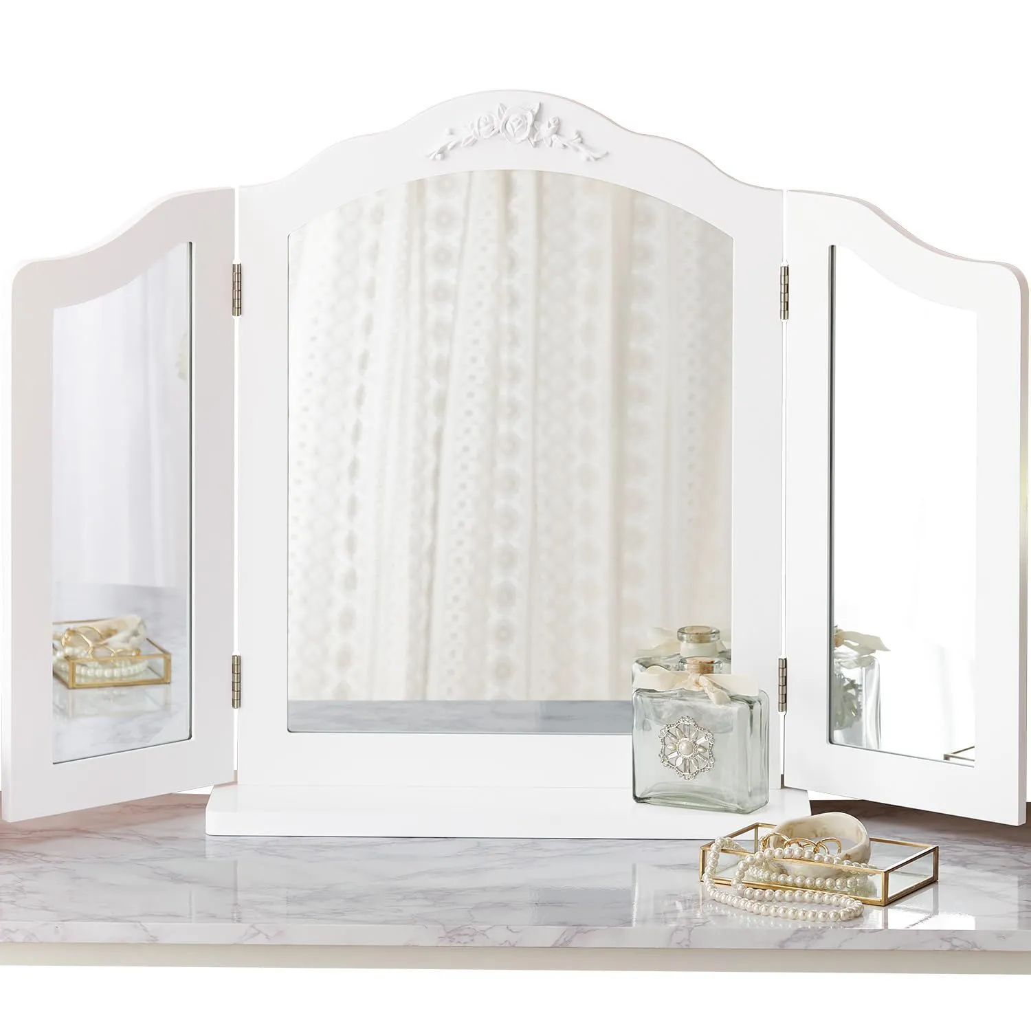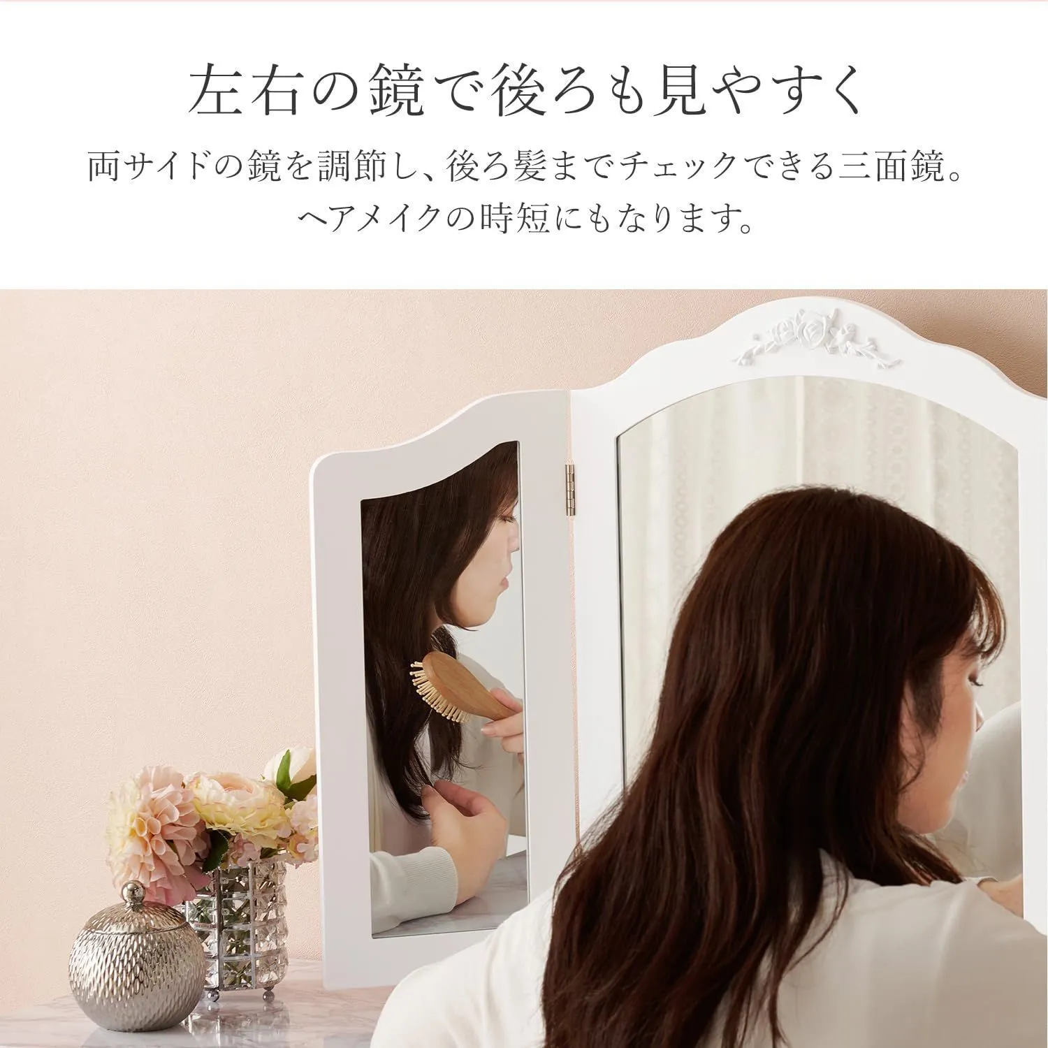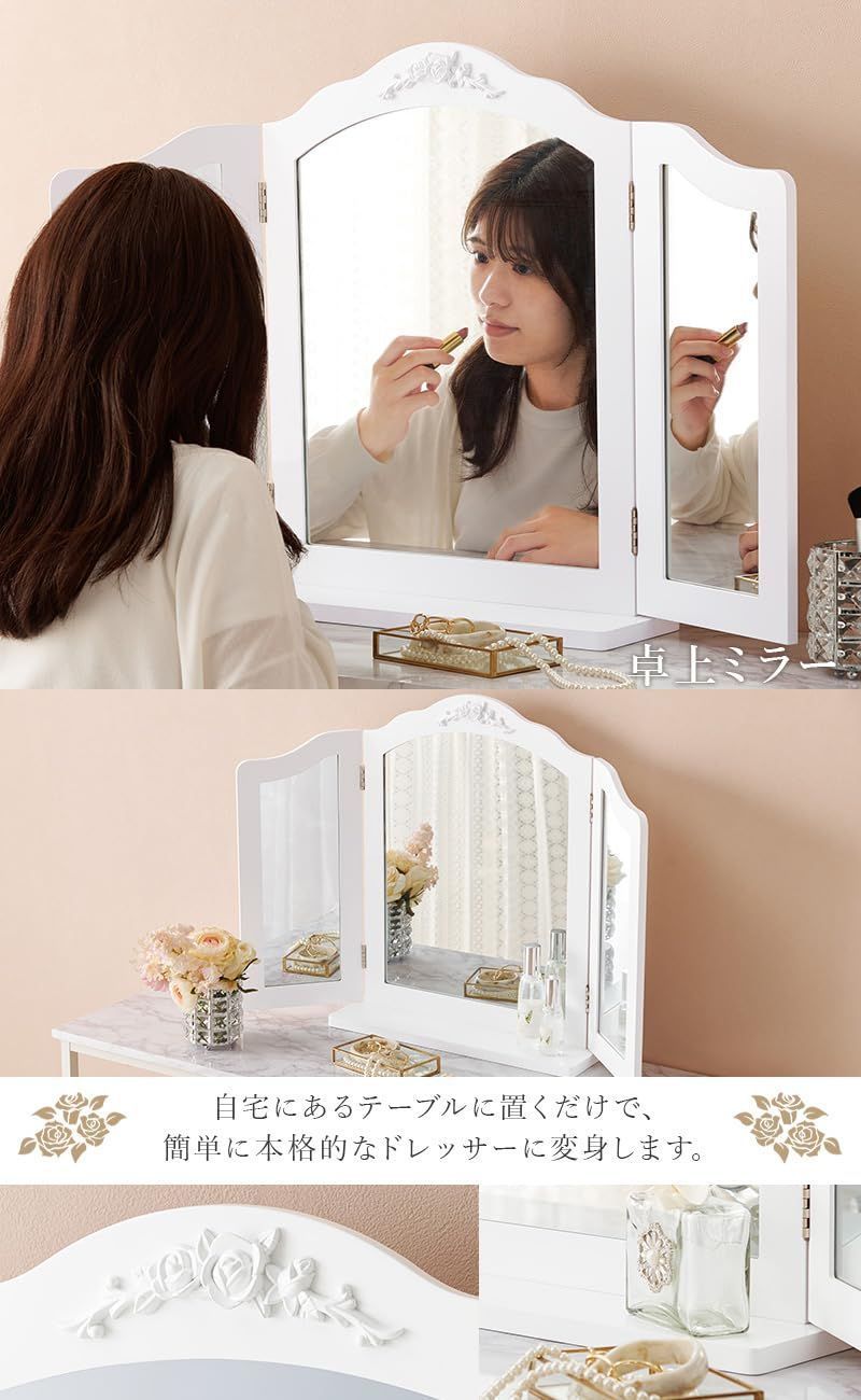 【憧れの女優ミラーを】上部の中央にあしらわれたローズレリーフのモチーフが特別感を醸し出す、ホワイトのシンプルなシルエットの中のさりげない曲線がエレガントな三面鏡ミラー