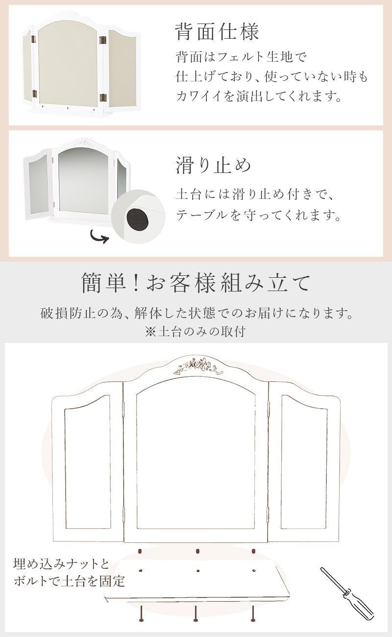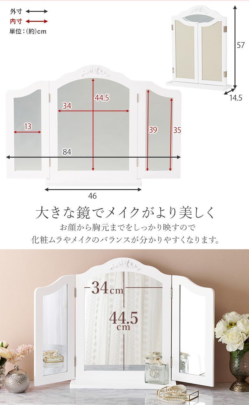 萩原 三面鏡 卓上 女優 ミラー 姫系 エレガント 折りたたみ 大きめ ライトなし 幅84 奥行14.5 高さ56.5 ホワイト MD-6697WH