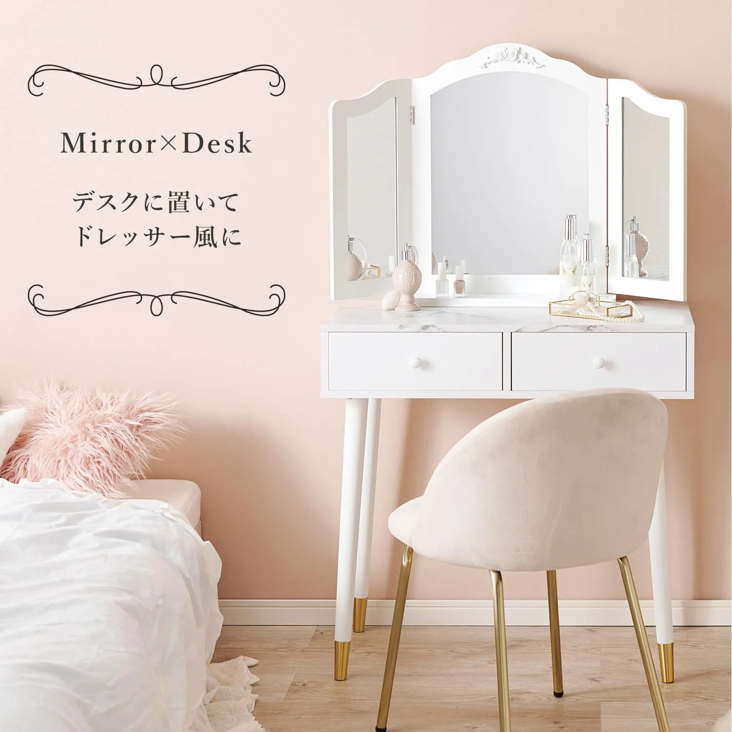 【お部屋のデスクをドレッサーに】手持ちのデスクやローテーブルとの組み合わせれば憧れのドレッサーを作れます。