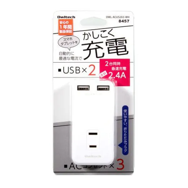 Owltech オウルテック マルチAC充電器 USB×2、コンセント3個口 OWL-ACUS2A3-WH (2650943)