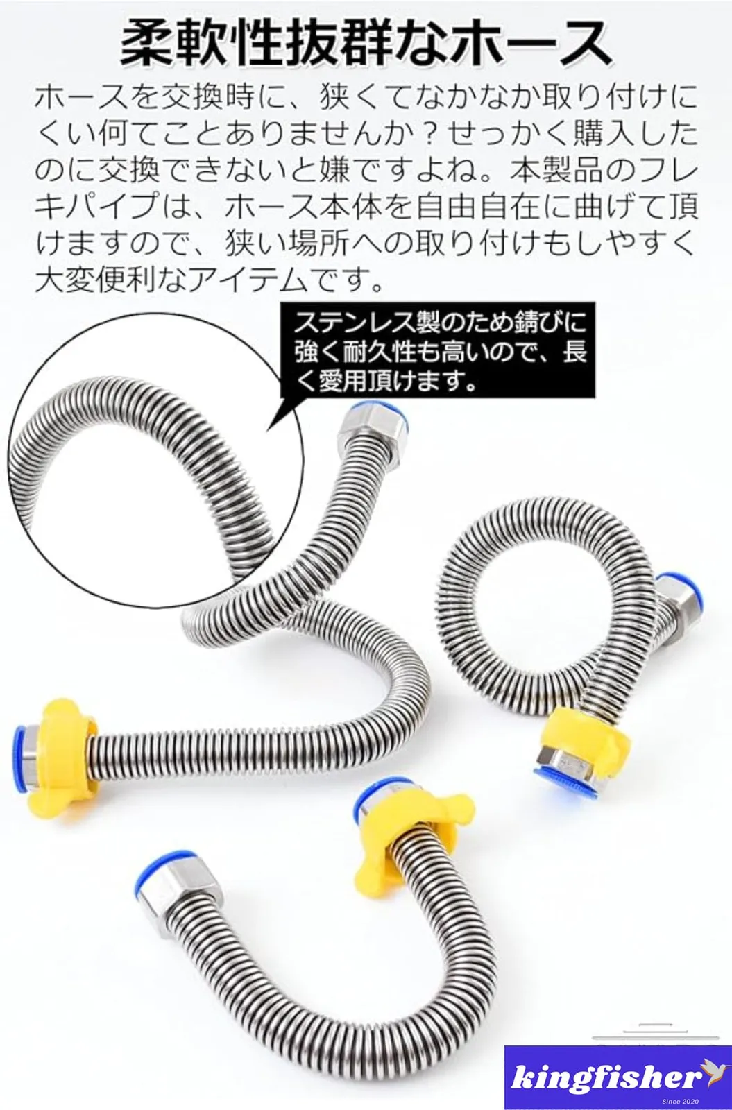 【主な特徴】 ✔ 高強度ステンレスメッシュ(SUS304)採用:耐圧・耐熱・耐腐食性に優れ、長期間安心してご使用いただけます。 ✔ 優れた柔軟性:硬すぎず柔らかすぎない絶妙なしなやかさで、狭所でもスムーズに設置可能。 ✔ 漏れ防止設計:二重構造により、水漏れ・破損を強力にガード。安全性と信頼性を追求。 ✔ 多用途対応:給湯器接続・温水器など、業務用にも家庭用にも最適。