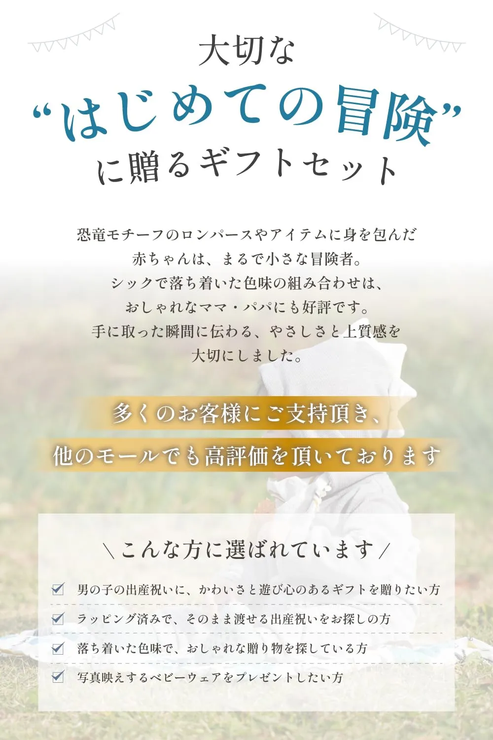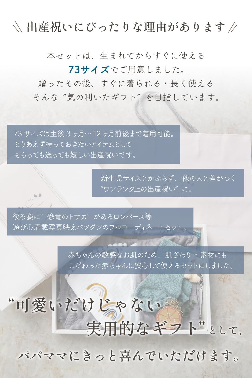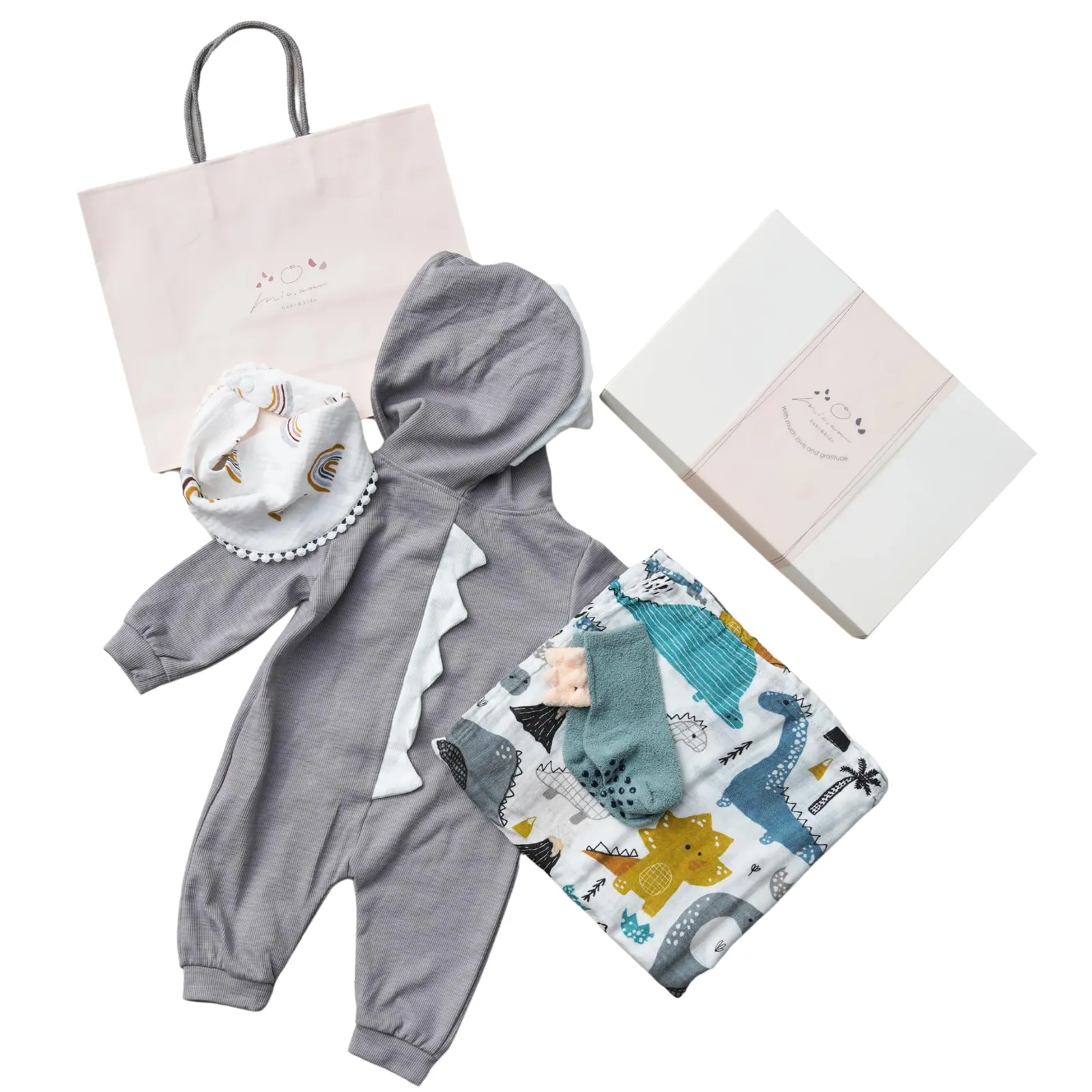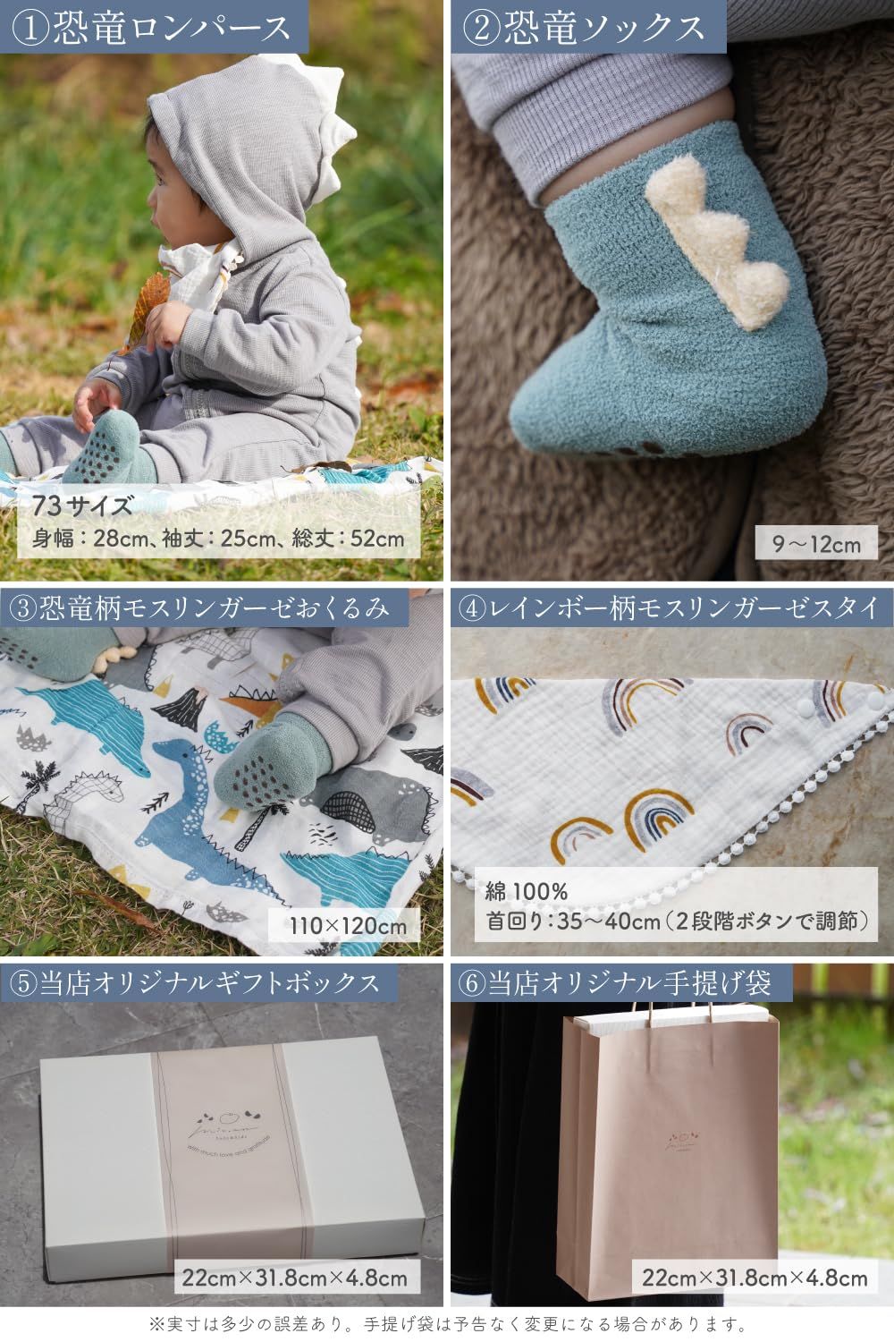 【すぐに贈れるラッピング付き】オリジナル手提げ袋付きで、そのまま渡せる便利な出産祝いギフト 赤ちゃんの健やかな成長を願って、心を込めてお包みした恐竜モチーフの出産祝いギフトセットです。後ろ姿まで可愛い「なりきり恐竜ロンパース」をはじめ、赤ちゃんの毎日に役立つモスリンガーゼ素材のおくるみやスタイ、もちもち素材のソックスなど、実用性とかわいらしさを兼ね備えた人気アイテムを詰め合わせました。 ロンパースは綿混素材で春先まで快適に着用でき、ジッパーは赤ちゃんの肌に優しいカバー付き。おくるみは大判で使い勝手が良く、お昼寝や冷房対策、スワドルとしても活躍します。スタイは吸水性の高い二重ガーゼで、デリケートなお肌にもやさしい設計。トサカ付きのソックスは、恐竜モチーフで遊び心も満載です。 当店オリジナルの手提げ袋付きなので、届いてすぐにそのまま贈れるのも魅力。出産祝いやハーフバースデー、1歳のお祝いにも喜ばれる、見た目も機能も満足のベビーギフトセットです。