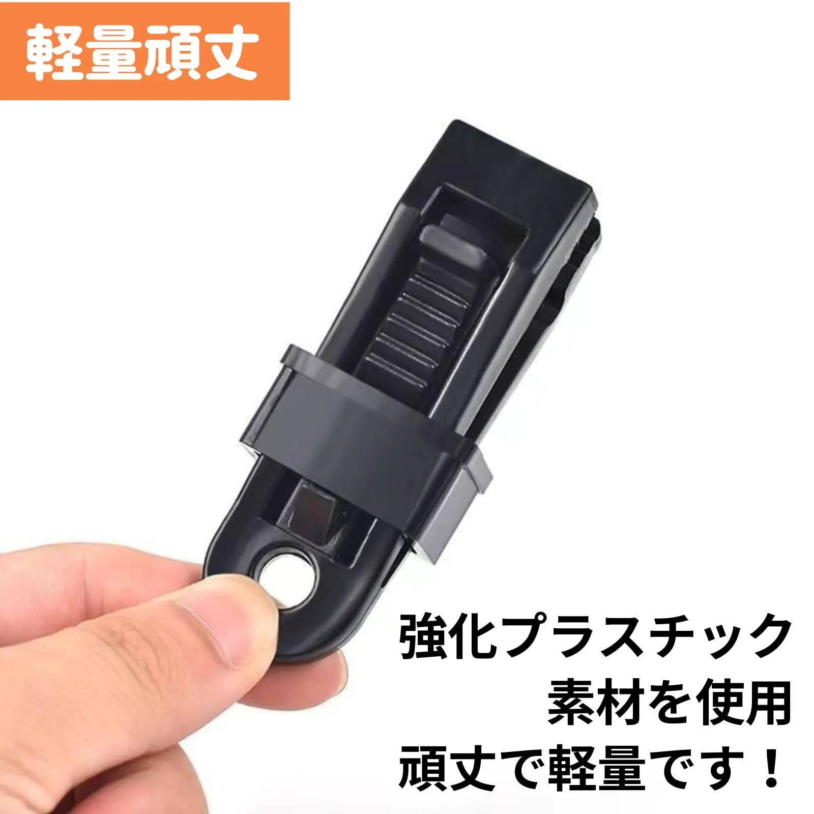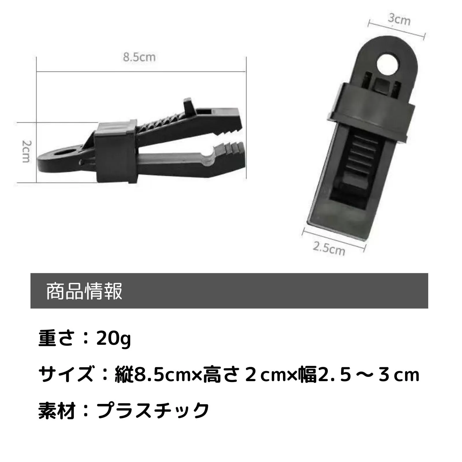 ✅穴がなくても簡単にテントやタープを固定できる便利なクリップです。✅強度プラスチック素材で錆びることがないので雨の日や日差しの強い日でも劣化が少なく丈夫で長持ちです。✅クリップのギザギザ部分で、強風の日でもしっかり挟んで強力に固定します。✅利用シーン:屋外のキャンプやタープの設営。トラック、船、自転車、プールなどのカバー。サンシェードなどに最適です!✅重さ:20g、サイズ:縦8.5cm×高さ2cm×幅2.5〜3cm、素材:プラスチック