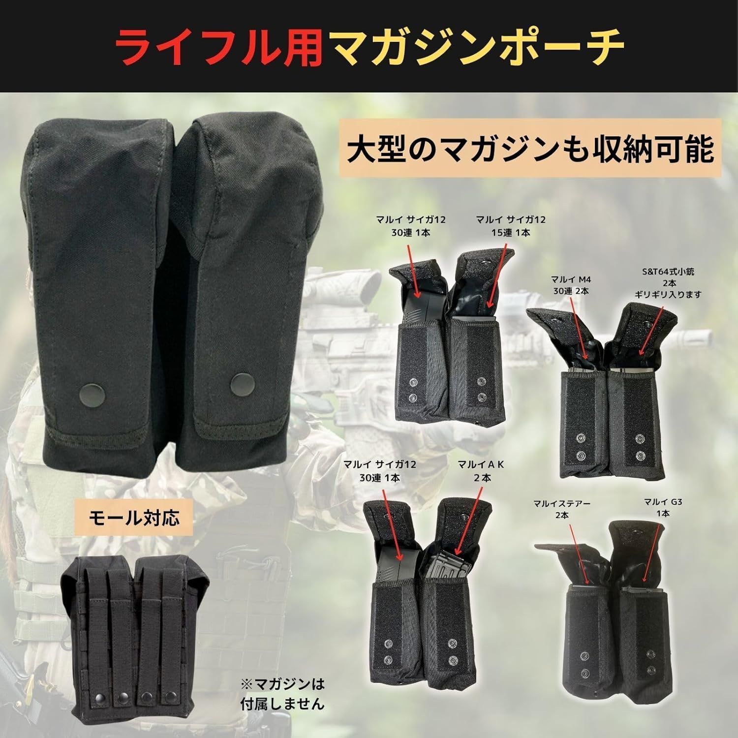 【ライフル用マガジンポーチ】 サイガ12ショットガン用マガジンを1本x2(計2本)、AK系(AK47、AK74、AKMなど)の7.62mmマガジンを2本X2(計4本)収納可能な専用ポーチです。各種マガジンのサイズに対応した設計で、厚みのあるマガジンやカーブの強いスチールマガジンにもフィット。 入荷時期により、商品の仕様(パッケージ、容器、デザイン、サイズ、カラー、素材、表記など)が変更する場合があります。生産時期により色、細部が変更になる場合がありますご了承ください。モニターや光の加減で実際の見え方と違う場合があります。金属アレルギーの方はご購入をお控えください。ボタンの摺動抵抗には個体差があります。製造時、輸送時における、使用に差支えのない傷や変形がある場合があります。製品の検品の際の開封や箱の痛みのある場合があります。小さな部品があります。口の中には絶対に入れないでください。窒息などの危険があります。小さなお子様やペットの手の届かない場所に保管して下さい。本品を無理な力を加えて乱暴に扱わないでください。破損やケガの原因となり危険です。