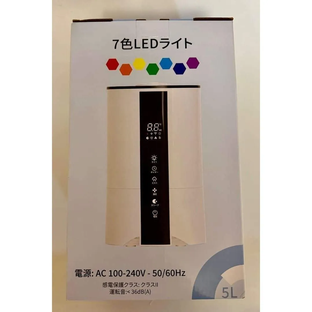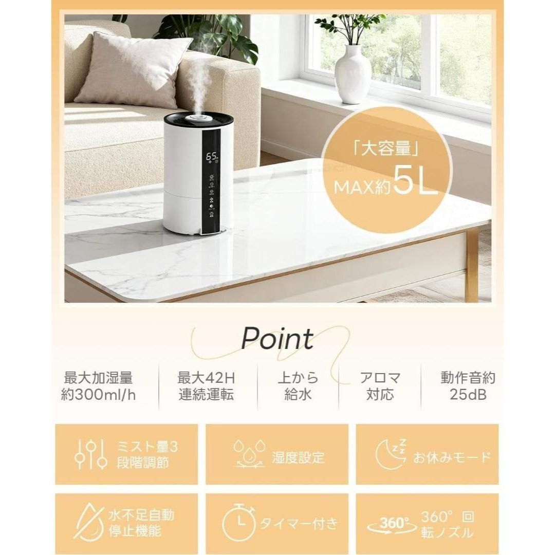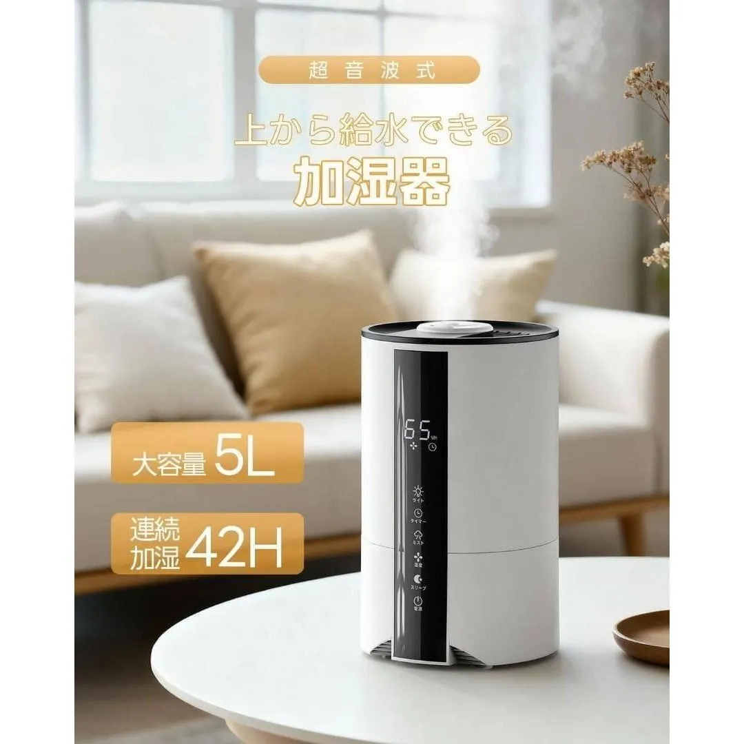 ■おすすめポイント ──────────────── **5Lの大容量タンク** 頻繁な給水が不要で、就寝中や在宅ワーク中も安心。 長時間連続運転できるので、夜の乾燥対策にも最適です。 **上部給水式でストレスなし** フタを開けてそのまま注ぐだけ。 本体を持ち上げる必要がなく、水こぼれの心配もありません。 **自動湿度調整機能搭載** お部屋の湿度に合わせて自動でミスト量を調整。 加湿しすぎを防ぎ、快適な空間をキープします。 **3段階ミスト+静音設計** 動作音がとても静かなので、 ・寝室 ・赤ちゃんのいるお部屋 ・在宅ワーク、オフィス でも気になりません。 **タイマー機能(1〜12時間)** 消し忘れ防止で省エネ。 就寝前の使用にも安心です。 **スリープモード&夜間ライト** LEDディスプレイは就寝時に減光可能。 やさしいライトで、夜間の使用も快適です。 **空焚き防止・自動停止機能付き** 水がなくなると自動で停止する安全設計。 ご高齢の方やプレゼント用にも安心です。 ────────────────