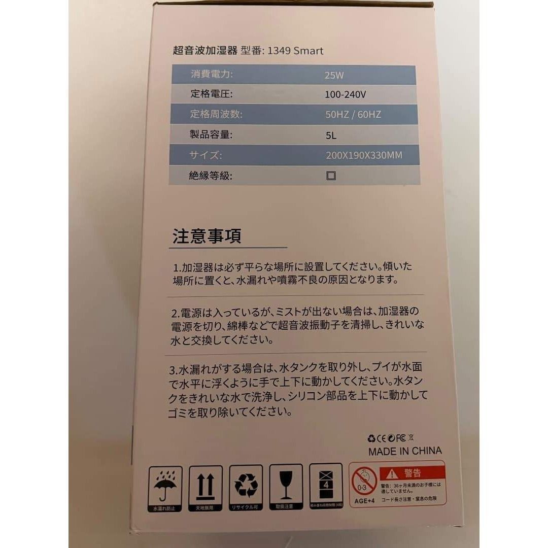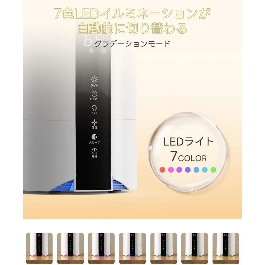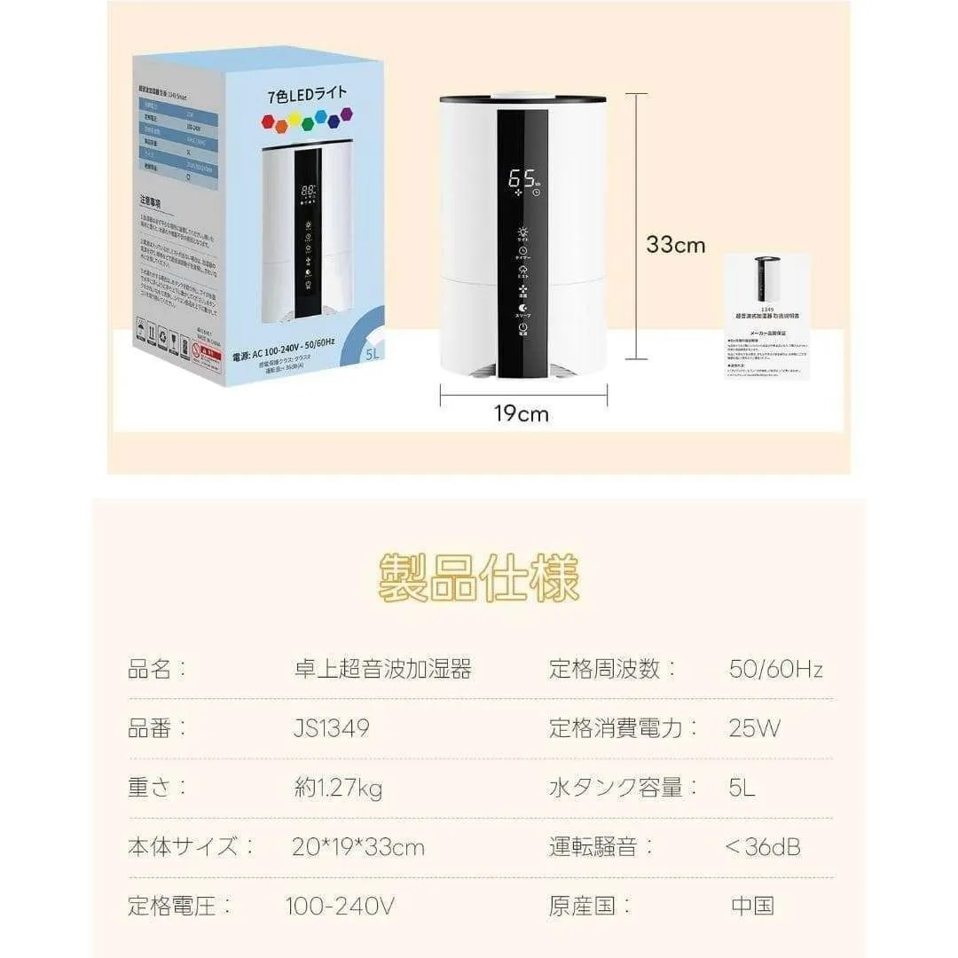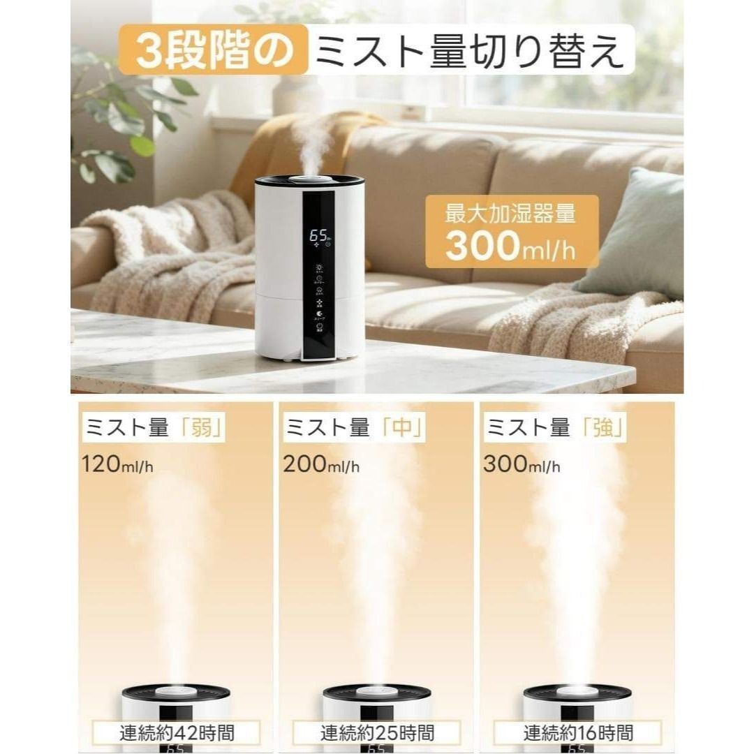 ■おすすめポイント ──────────────── **5Lの大容量タンク** 頻繁な給水が不要で、就寝中や在宅ワーク中も安心。 長時間連続運転できるので、夜の乾燥対策にも最適です。 **上部給水式でストレスなし** フタを開けてそのまま注ぐだけ。 本体を持ち上げる必要がなく、水こぼれの心配もありません。 **自動湿度調整機能搭載** お部屋の湿度に合わせて自動でミスト量を調整。 加湿しすぎを防ぎ、快適な空間をキープします。 **3段階ミスト+静音設計** 動作音がとても静かなので、 ・寝室 ・赤ちゃんのいるお部屋 ・在宅ワーク、オフィス でも気になりません。 **タイマー機能(1〜12時間)** 消し忘れ防止で省エネ。 就寝前の使用にも安心です。 **スリープモード&夜間ライト** LEDディスプレイは就寝時に減光可能。 やさしいライトで、夜間の使用も快適です。 **空焚き防止・自動停止機能付き** 水がなくなると自動で停止する安全設計。 ご高齢の方やプレゼント用にも安心です。 ────────────────