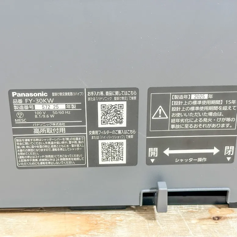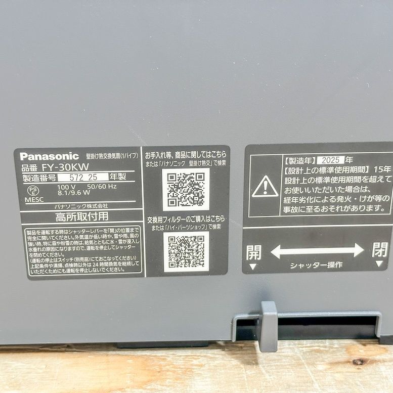 <Panasonic>壁掛け熱交換気扇 1パイプ グレー(型番:FY-30KW-H)【未使用アウトレット品】