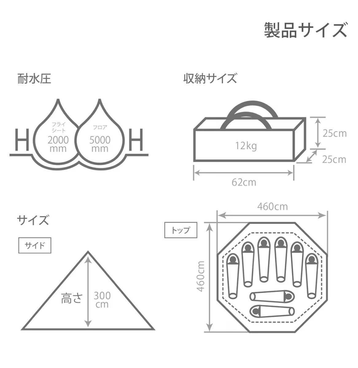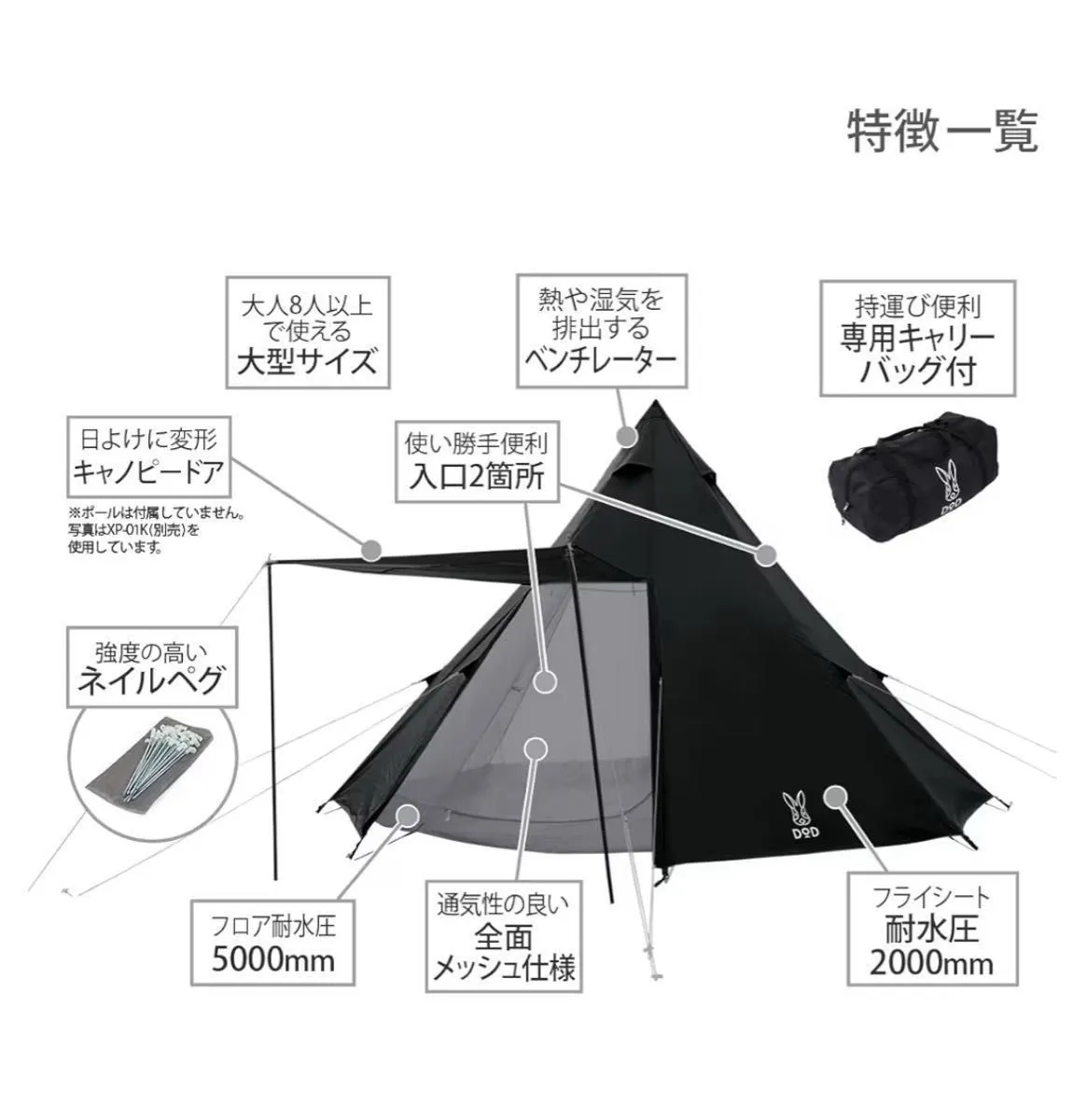 【商品紹介】 最大8人が就寝可能。 キャンプ場で注目度No1のビッグワンポールテント。 本体外側にペグを打ち込み、1本のポールを立てるだけの超シンプル構造。 最大8人が就寝可能な床面積がありながら、必要なパーツが少ないため、収納時はコンパクトになります。 スタイリッシュな外観は、キャンプ場やフェス会場などでも、他のテントとは一線を画すファッション性をアピールします。 広々としたテント内部 大人8人がゆったり寝ることができる床面積を確保。4~6人程度であれば広々と使用できます。 アルミY型ペグ 軽くて曲がりにくいアルミ製Y型ペグが付属されています。 コンパクトサイズ 必要なパーツが少ないことにより、収納時のコンパクト性を極限まで高め、わずか直径240mm、長さ600mmに収納が可能です。 出入口2ヶ所 大人数のキャンプでも出入りしやすいように出入口を前後2ヶ所に配置しています。 ベンチレーター テント上部の4ヶ所のベンチレーターにより、テント内部の熱や湿気を排出。 テント内部の快適環境を保ちます。 形状...ワンポールテント 最大収容人数...7人~ 重量...5kg〜 ワンポールテントL T8-200-BK ブランド:DOD 色:ブラック系 テント定員:7人以上 テント室内短辺(cm):360.0 cm テント室内最大高さ(cm):300.0 cm テント付属品:ペグ 張り綱