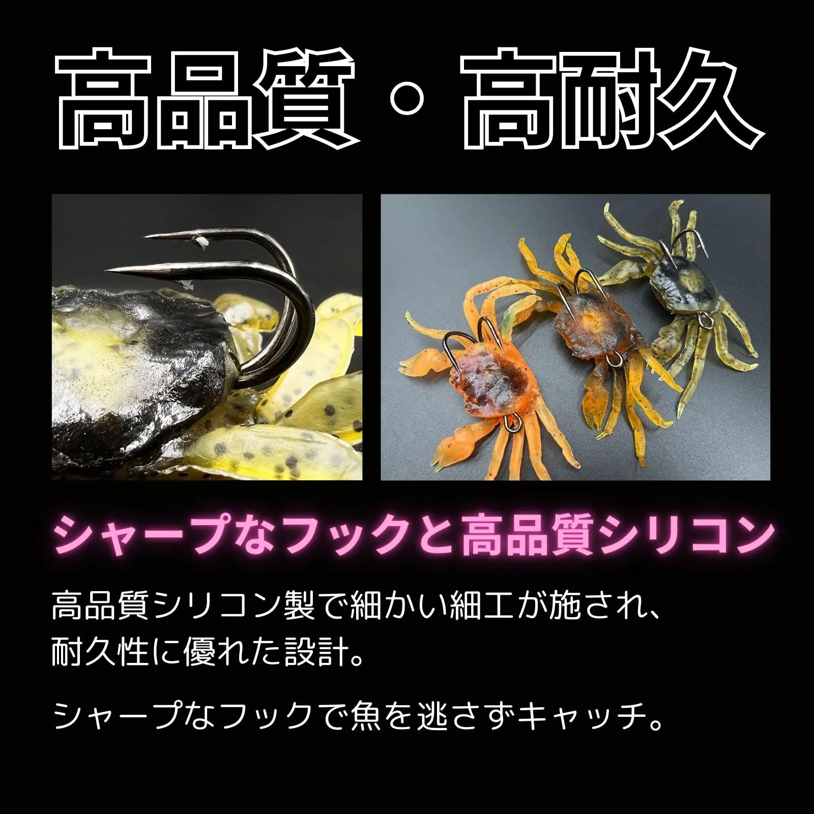 【高品質・高耐久】 高品質シリコン製で細かい細工が施され、耐久性に優れた設計。シャープなフックで魚を逃さずキャッチ。
