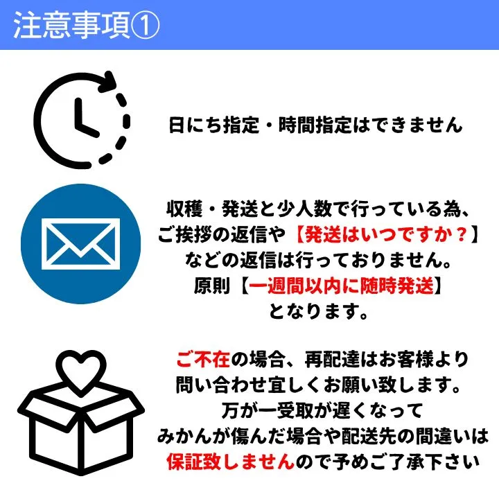 ●こちらは減農薬なので皮にキズがあるものが混ざります。 以下注意事項です。 ※重量※ 5kg(箱込み重量) ※発送※ ご購入いただいてから1週間以内に収穫し、順次発送となっております。 で発送日の確認についてのメッセージの返信や、 購入後のご挨拶を割愛させて頂いており、 返信はしておりませんのでご了承くださいませ。 ※メッセージについて※ ご好評を賜りまして多くのお客様とのやり取りをしております。 そのためすぐにお客様のメッセージが流れてしまい、気付けない場合がございます。恐れ入りますが、送信後24h以上経過した場合は再度ご連絡頂けますと幸いです。 ※配送地域について※ 天気の関係で前後する可能性があります。 こちらは東北~九州地方の方限定販売となります。 北海道、沖縄県への配送も承っておりますので、 コメントを頂ければ専用出品致します。 ※割れや痛みについて※ 収穫後すぐに発送しておりますが、 配送中の温度の差や、配送中に果実同士が押されて潰れ・割れ・痛みが起きる場合があります。 気を付けて梱包しておりますが、どうしても配送中に傷みなどが生じてしまう場合がございます。 こちらで保証などは行っておりませんのでご了承ください。 ※受注後収穫しておりますのでお客様都合によるキャンセルはお受付しておりませんのでご理解よろしくお願い致します。 上記に関しましてご一読いただいてからご注文いただくように宜しくお願いします。