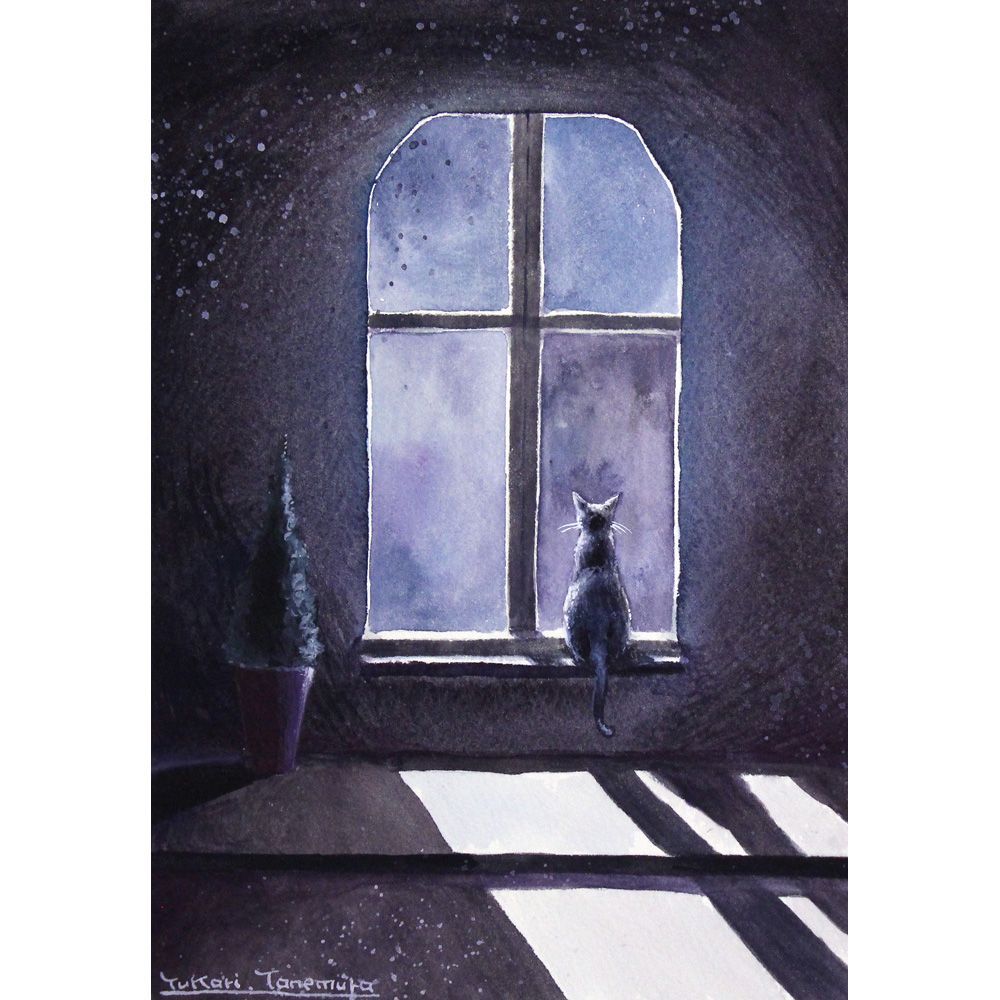 #月 夜 窓 月光 影 光 猫 アート イラスト