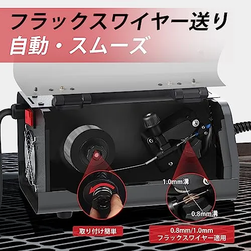 【付属品】日本語取扱説明書、アースクリップ付きコード、ワイヤーブラシ付きハンマー、軟鋼用フラックスワイヤーφ0.8mm1kg、チップ0.8mm*21.0mm*2、トーチノズル*2、ショルダーベルト、グローブ、溶接遮光面