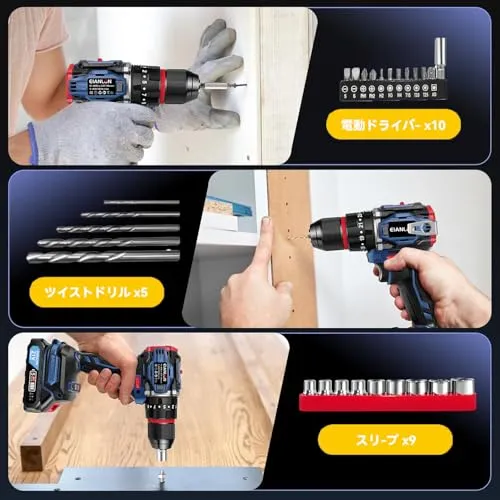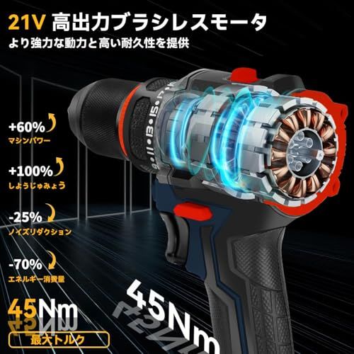 【ブラシレスモーター電動ドリル】電動ドライバー高品質の合金製ビットを採用しはパワフルなブラシレスモーターを搭載しています組み合わせることで、強力で効率的な穴あけを実現する,最大トルク45N・m。コードレス設計なので、電源がない場所でも手軽く使えます,マキタ18Vバッテリー対応。