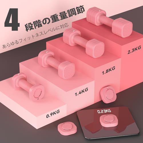 ダンベルは、1個あたり0.92.3kg、1ペアあたり1.84.6kgの範囲で調節可能です。(最大総重量:約4.6、1ペア単位での販売となります。)