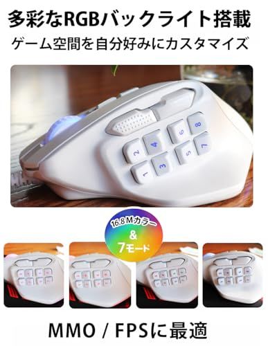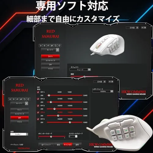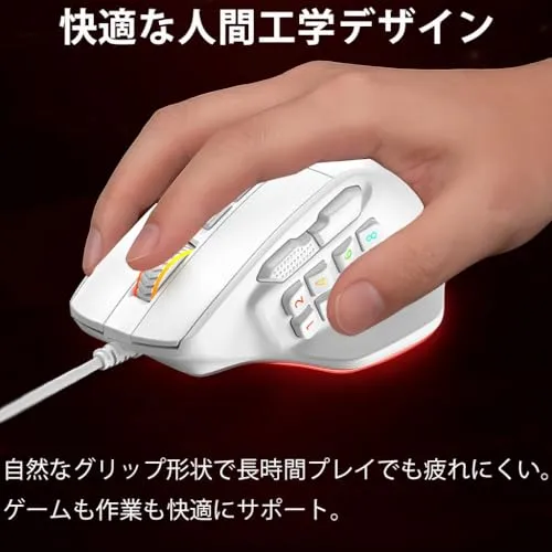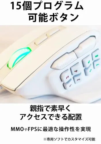 【送料無料】Red samurai 有線ゲーミングマウス 白 15ボタン MMO/FPS対応 12400DPI RGBライト カスタマイズ可能 プログラムキー搭載 ホワイト