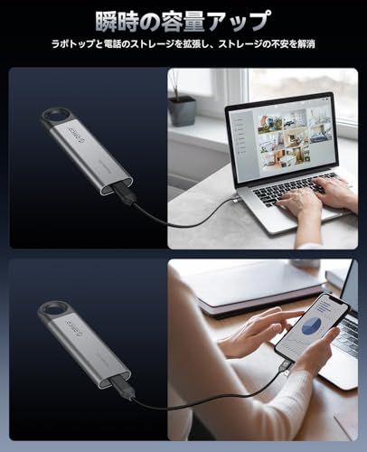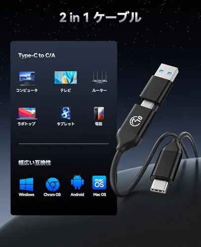 【2 in 1ケーブルで多デバイス対応】付属のUSB-C to C/A 2 in 1ケーブルにより、Windows/macOSパソコンはもちろん、Androidスマホ・iPad・ゲーム機など幅広い端末にプラグ&プレイ。面倒な設定なし即挿即用ですぐに使用可能。 高速データ転送】最大読み取り速度1050MB/sの高速転送により、大容量ファイルや日常的なバックアップも瞬時に処理できます。作業効率が大幅に向上します。