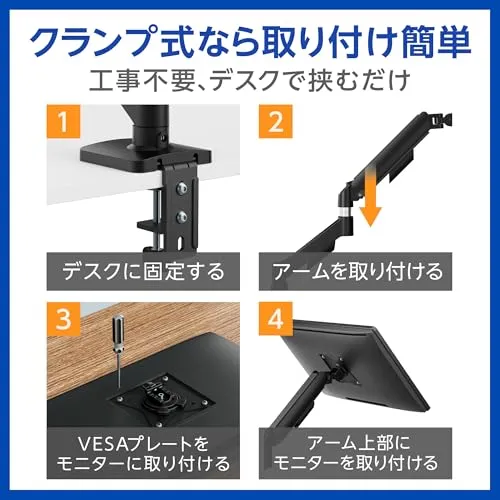 【組立て工数を大幅カット】土台(Cクランプ)を組立済みでお届け。土台の複雑なネジ締めが不要で、アームを接続してモニターをセットするだけで設置完了します。