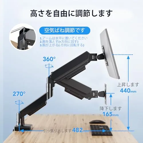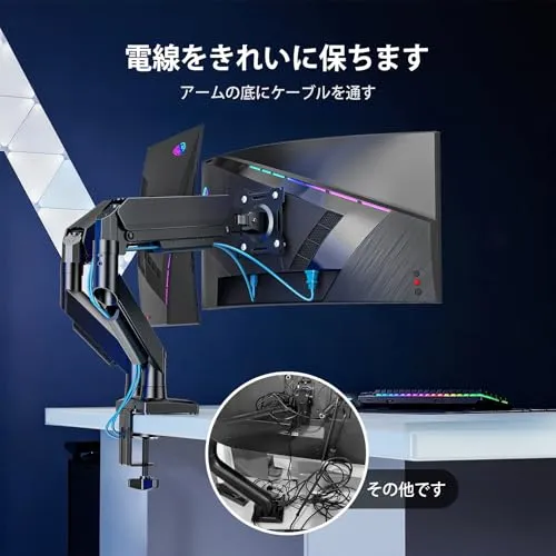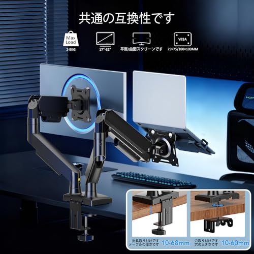 【互換性】当社のディスプレイスタンドは、1732インチのフラットまたは曲面LCD/LEDディスプレイの大半に対応しています。関節式ガススプリング構造を採用したこのデュアルモニタースタンドは、最大8.9kgの耐荷重を実現。VESAマウント穴ピッチは最大100100mm、対応デスク厚は1068mmです。