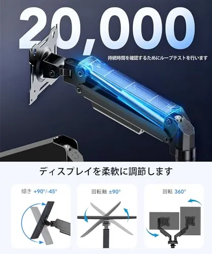 【チルト&高さ調節】当社デュアルモニタースタンドは-45の画面チルト、上下90の角度調整、水平365の回転を実現。人間工学に基づいた画面位置調整で首・目・背中の負担を軽減し、最適な快適視聴体験を提供します。