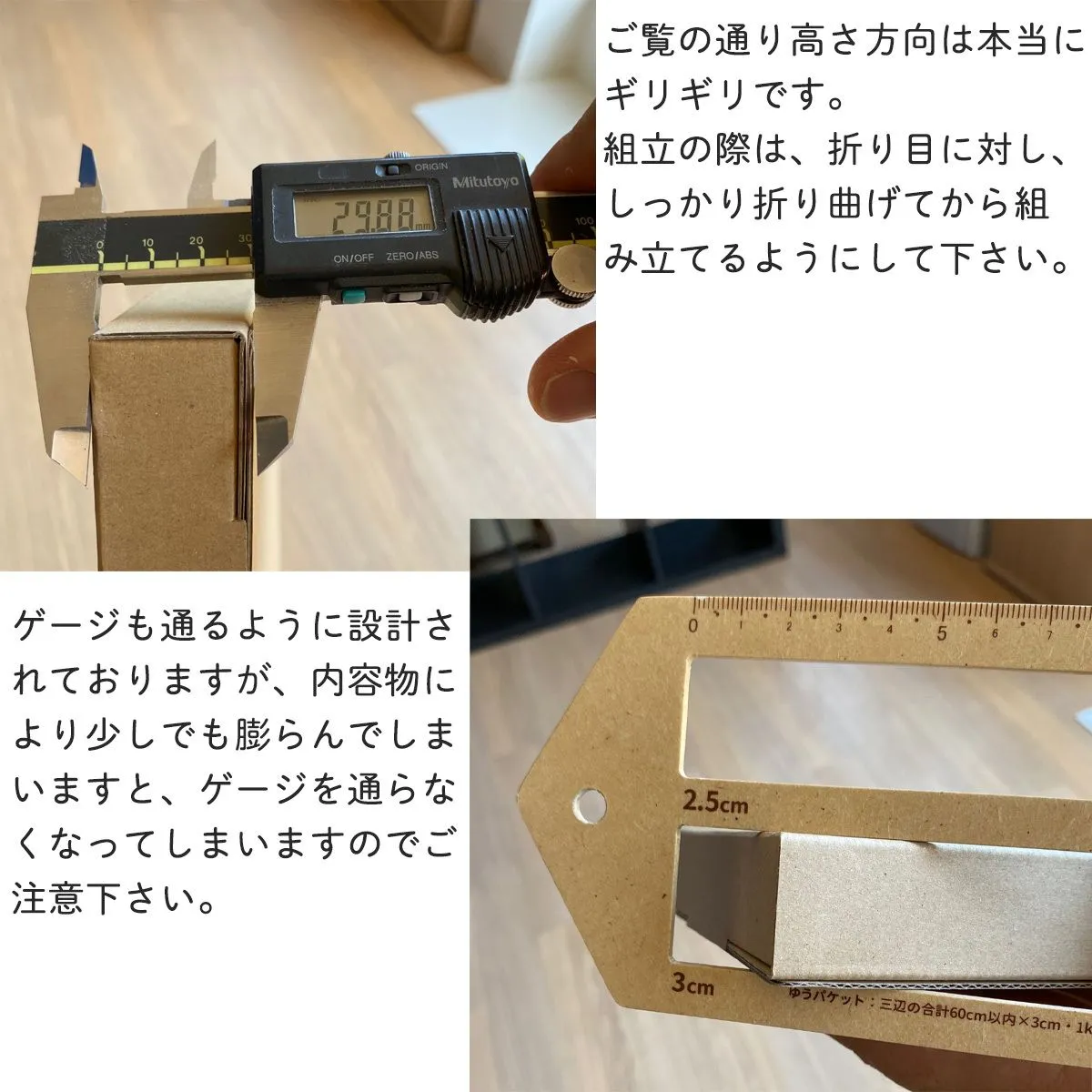■ご注意 組み立ての際には詰めすぎによる膨らみ・内容物の重さにお気を付けてください。 また、投函前には梱包サイズ・重さをいま一度ご確認ください。 ※次のサービスには使えません ネコポス : 31.2×22.8×2.5cm以内、1kg以内 ゆうパケット : 3辺合計60cm以内、厚さ3cm以内、最長辺34cm以内、1kg以内 レターパックライト : 34×24.8×3cm以内、4kg以内