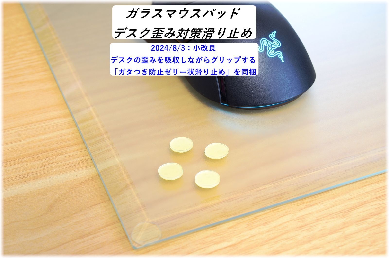 ■デスクの表面が歪んでいると、ガラスマウスパッドを設置した際にガタつきが発生する場合があります。この現象に対する対策として、汚れが付着しても水洗いで吸着性能が再復活する、歪みを吸収しながらグリップする日本製「ガタつき防止ゼリー状滑り止め」を同梱します(従来の通常滑り止めも同梱)。