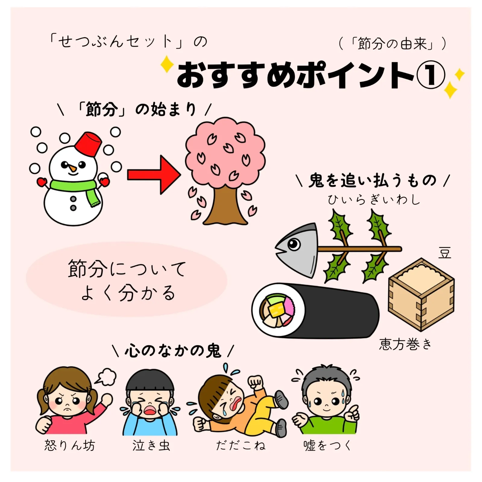 【節分の由来】分かりやすく由来を説明していきます。心のなかに住むオニや、豆まき・恵方巻き・ひいらぎいわし等も知ることができる!