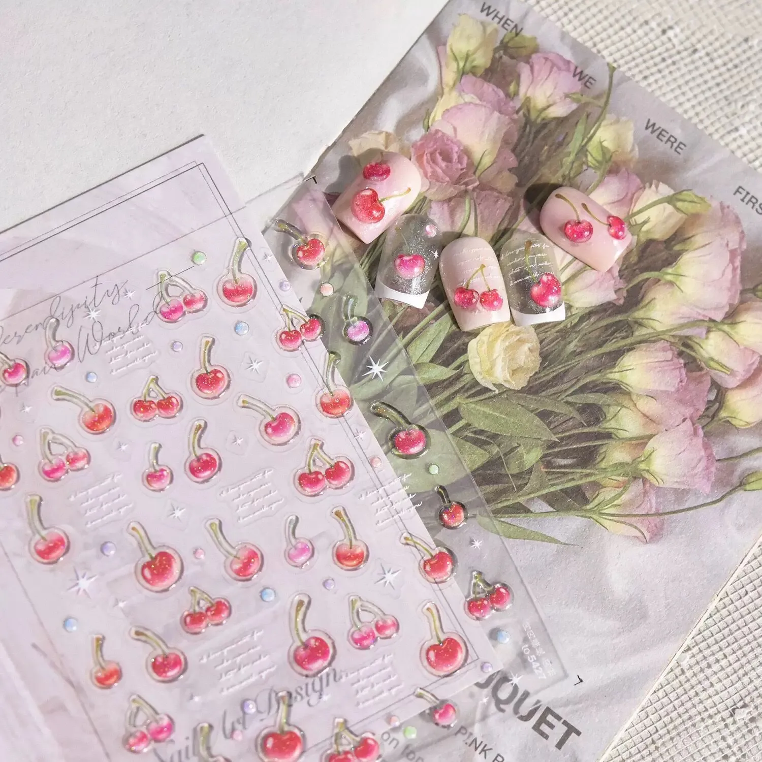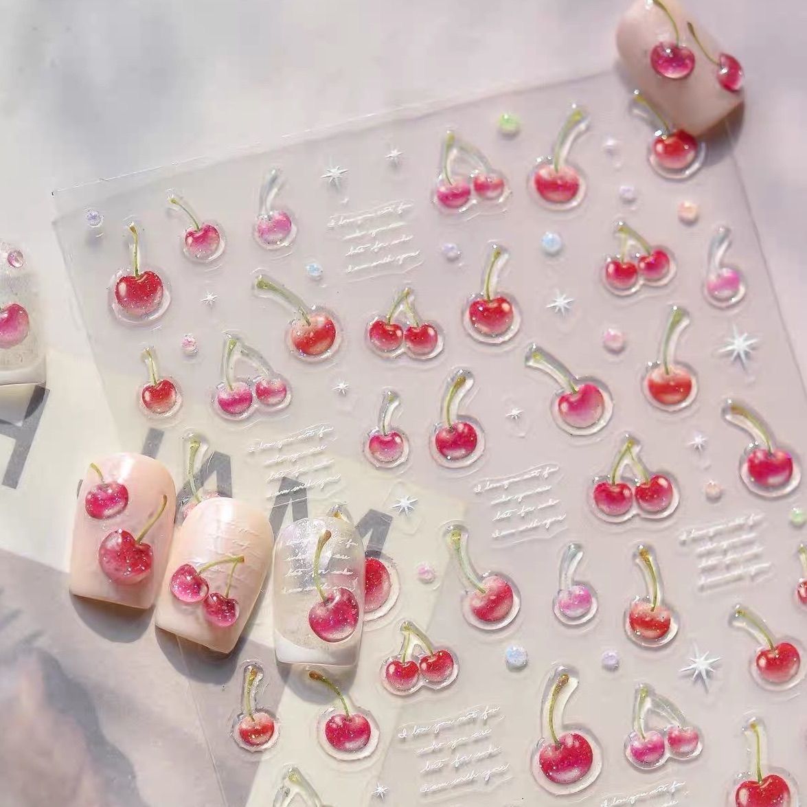 シール ステッカー セルフネイル ハンドネイル フットネイル ポリッシュ マニキュア ジェルネイル ネイルチップ つけ爪 付け爪 自爪 地爪 ネイルアレンジ レジン アクセサリー ハンドメイド デコ パーツ 素材 材料 エンボス加工 立体 3D 果物 フルーツ チェリー さくらんぼ キラキラ バブル