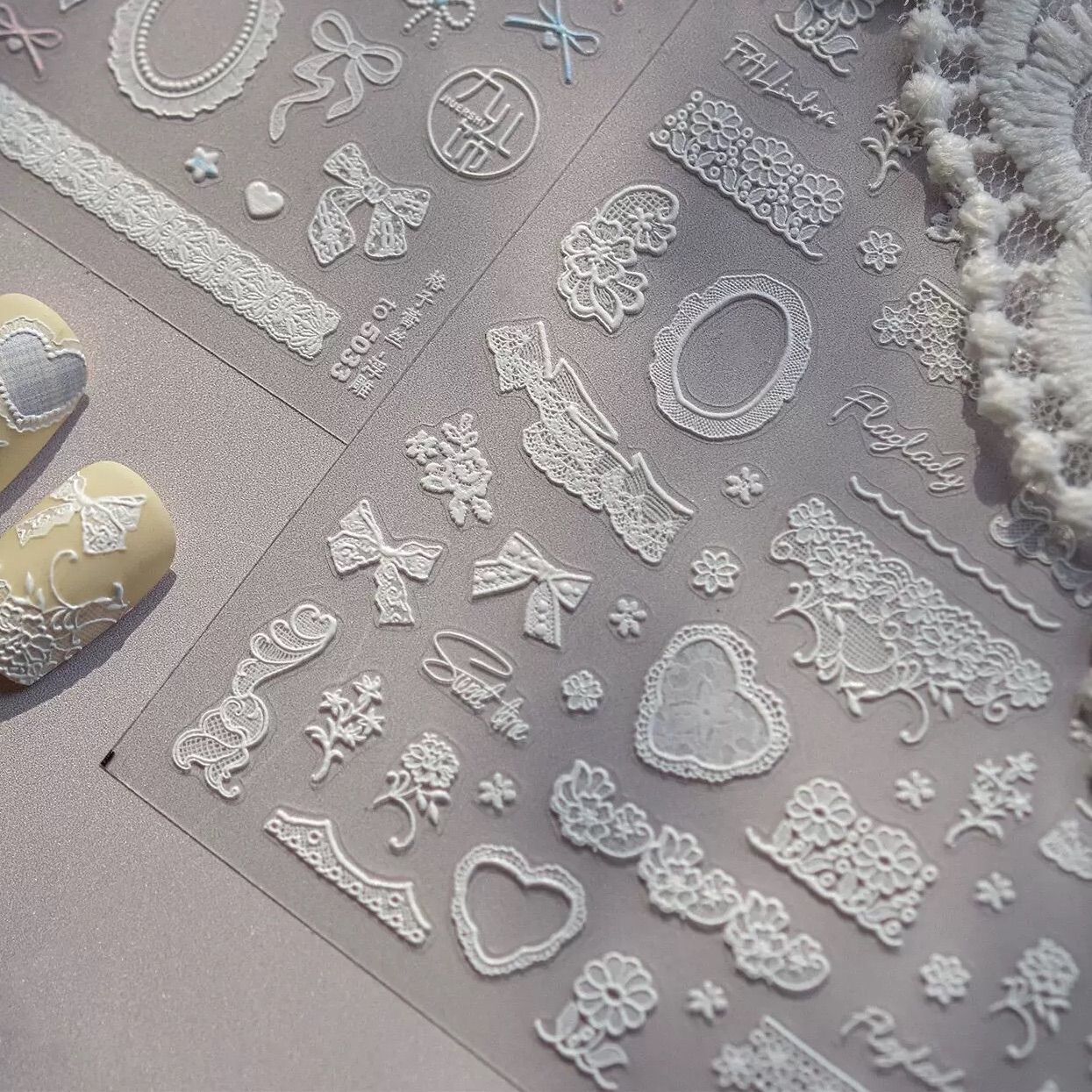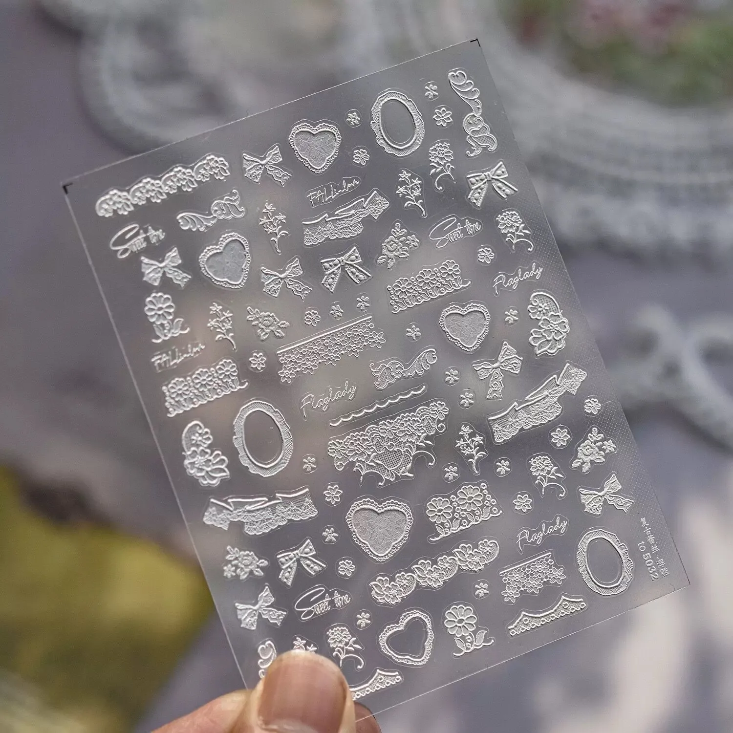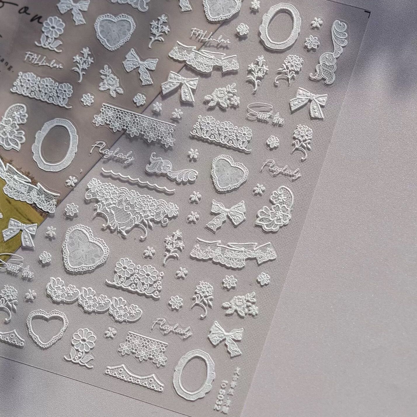 シール ステッカー セルフネイル ハンドネイル フットネイル ポリッシュ マニキュア ジェルネイル ネイルチップ つけ爪 付け爪 自爪 地爪 ネイルアレンジ レジン アクセサリー デコ パーツ 素材 材料 エンボス加工 立体 3D レース リボン フレーム レトロ フラワー 純白 花
