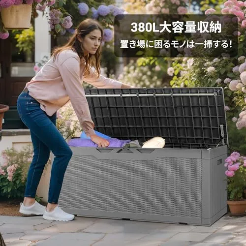 「マルチに活躍する大容量収納庫」:Alebert大容量収納ボックス、置き場に困るモノは一掃します!室内には置きにくい物の収納に困っでいる?家周りが散らがり、ご近所の視線が気になる?ゴミ出しの日までゴミ袋の保管場所に困っている?380Lの大容量でこれ一台で解決!レジャー用品、ガーデニング用品、掃除道具、資源ごみやポリタンクなどの荷物はまとめて収納できます。家の周りで散乱しがちなに荷物をすっきりし、ゴミによるカラスや猫のイタズラ対策にも最適です。
