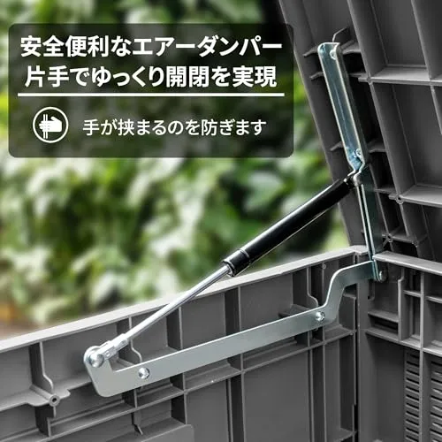 「豊富な機能・使い便利」:蓋の開閉はエアーダンパーの構造を採用しています。片手で軽い力で蓋を開閉でき、使い便利!また、開けったり閉めたり速度が緩やかになって、手が挟まれるのを防ぐことができます。両サイドに取っ手がついているので、箱を運ぶときに便利です。蓋に南京錠取付可能な構造がついており、別売りの南京錠を取り付けていただくことで盗難対策が可能です。