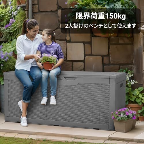 「商品仕様」:幅123*奥行57*高さ62cm (内寸:幅118*奥行51*高さ59.5cm)素材:PP樹脂/鋼 最大容量:380L 最大荷重:150kg ベンチとして、二人で座ってもぜんぜん大丈夫!