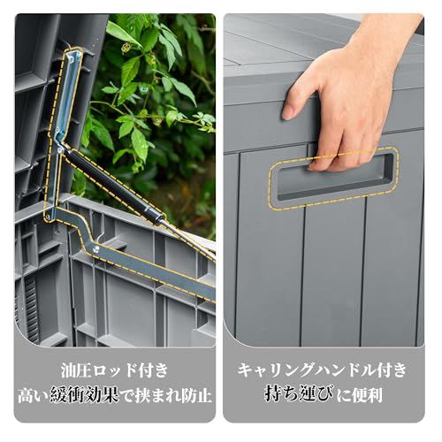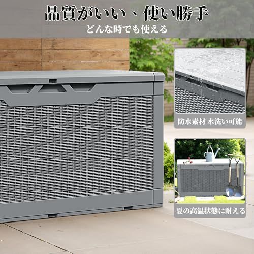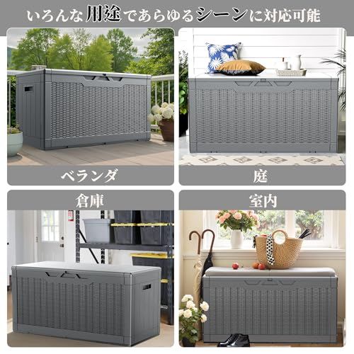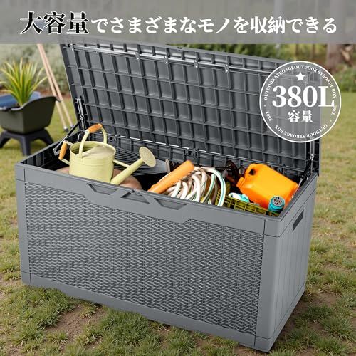 【大容量、さまざまなシーンに対応】大型の収納ボックス、サイズは123*57*62cm、容量は380Lで、収納スペースが広く、様々な物を収納することができます。屋外物置として、庭、ベランダ、ガレージ、倉庫などに置き、ガーデニング・園芸用品、レジャー用品、掃除用具、車の整備工具などを収納することができ大変便利です。ゴミ箱としても使えます。また、屋内の収納スペースとして活用すれば、部屋の雑然とした印象はなくなります。