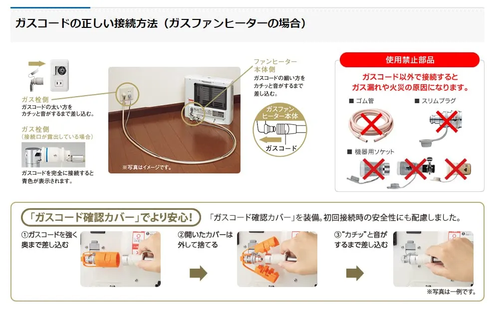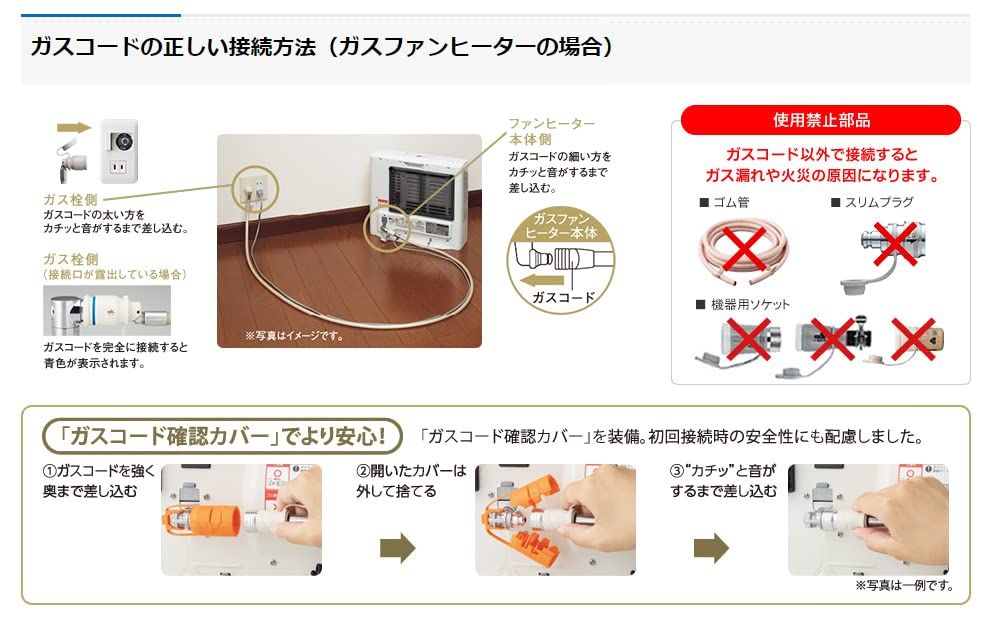 ご使用いただく機器のガス量(インプット)を確かめて適合するガスコードで接続してください。 ガス栓は接続部がコンセント形状でないと接続できません。 部屋ごし、隠ぺいでのご使用はできません。 機器を取り替える際は新品とお取り替えください。