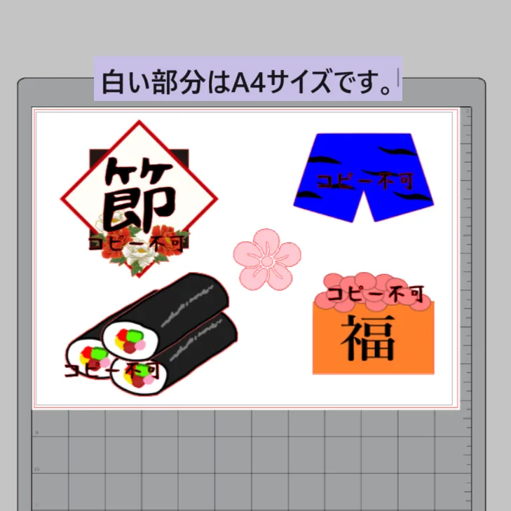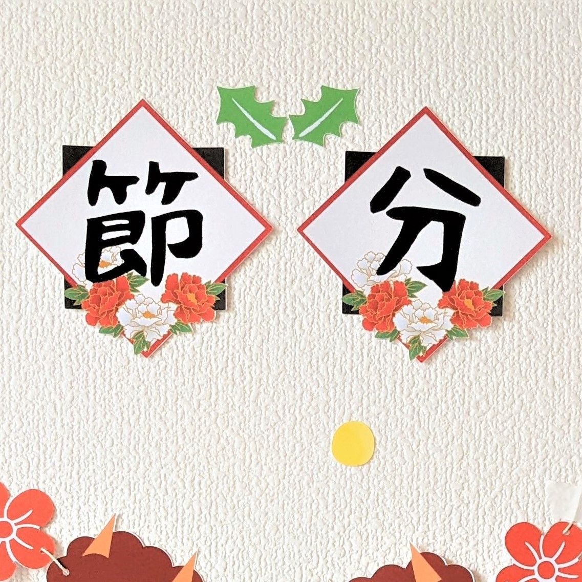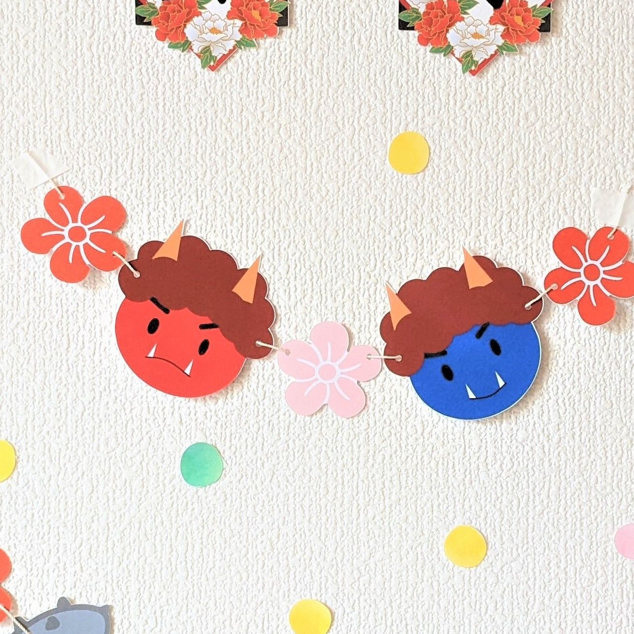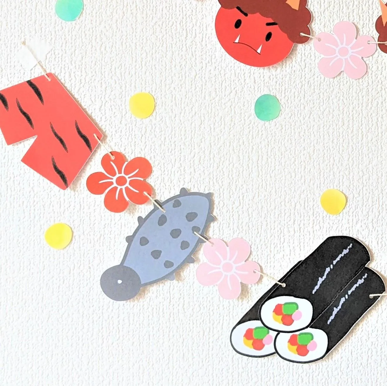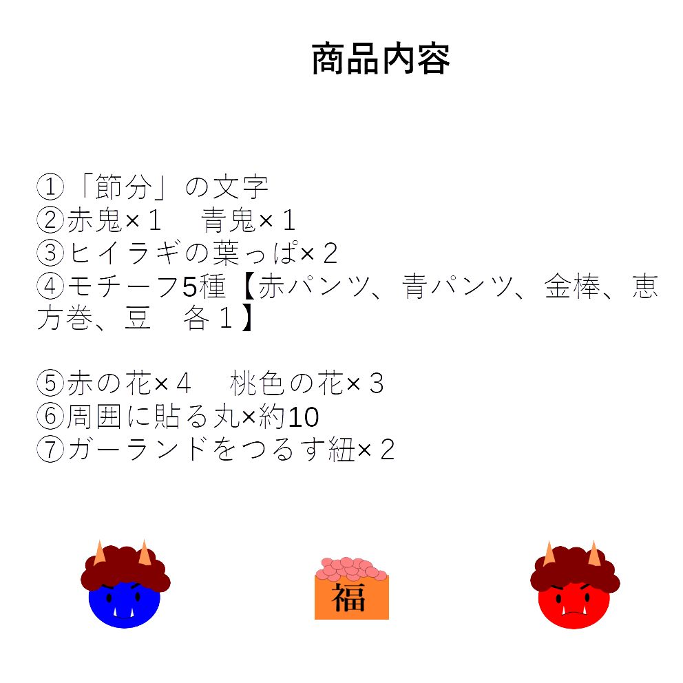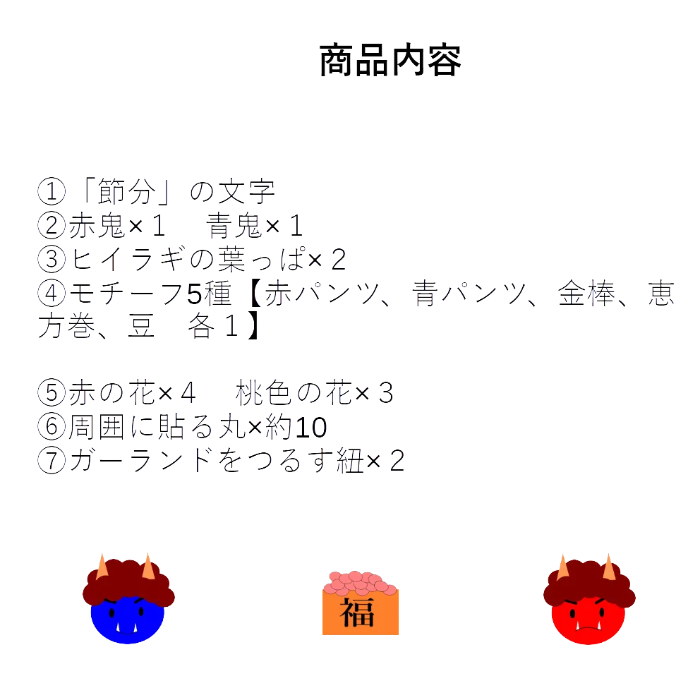 ◆ ・「節分」の文字 ・梅の花×7 ・赤鬼青鬼 各1 ・モチーフ5種(赤パンツ、青パンツ、金棒、恵方巻、豆) ・葉っぱ×2 ・周りに貼るカラフルな丸 約10個 ・ガーランドをつるす糸×2本