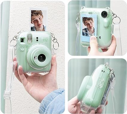 【送料無料】Rieibi【7点セット】instax mini 12クリアケース(カメラなし)、インスタックスミニ 12 チェキ カバー 透明 クリアケース ファイル収納 ポケット付き ショルダーストラップ付き ハード(グリーン)