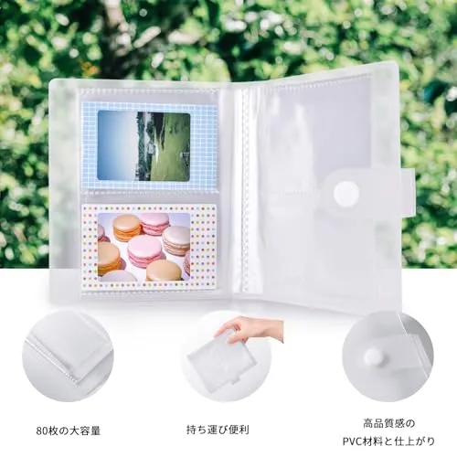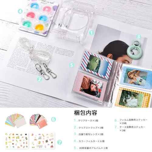 梱包内容:チャッキフィルム収納できるクリアケース*1個、ショルダーストラップ*1個、80枚容量のある写真アルバム*1個、特殊効果フィルター*6個、instax mini 12 自撮り接写レンズ*1個、面白いボーダーステッカー*40枚、DIY ステッカー*2枚。
