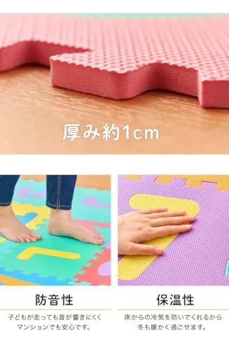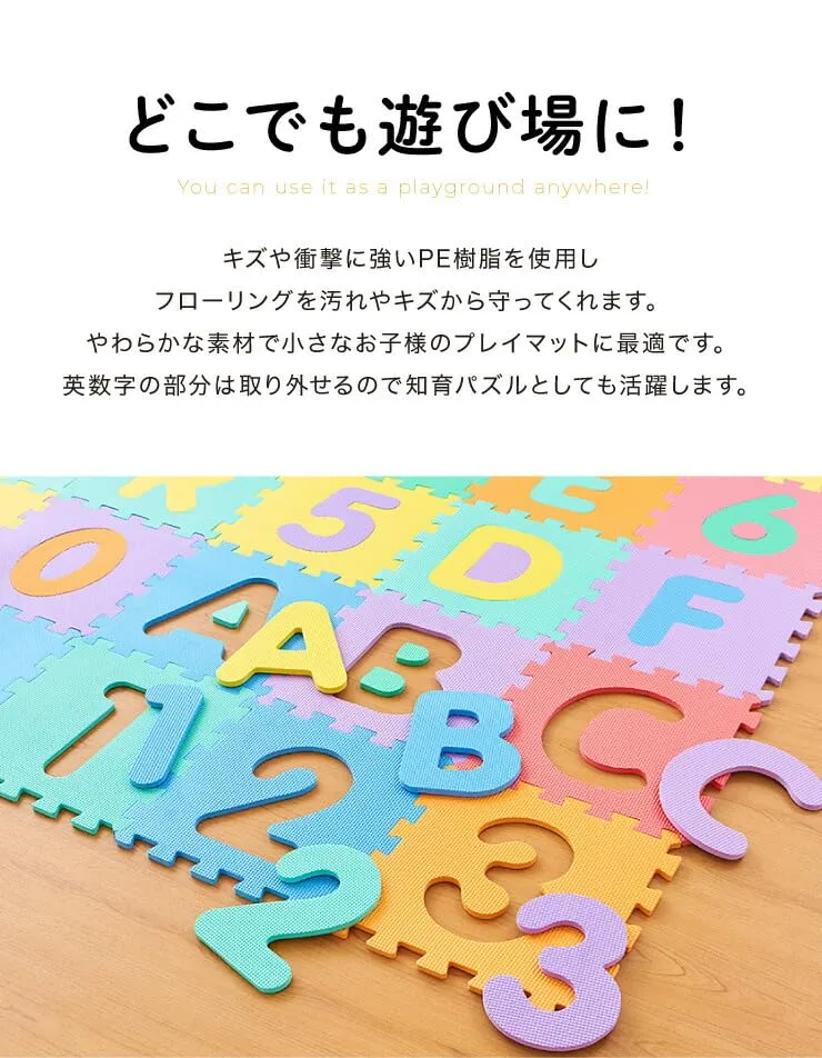 【どこでも遊び場に!】キズや衝撃に強いPE樹脂を使用し フローリングを汚れやキズから守ってくれます。 やわらかな素材で小さなお子様のプレイマットに最適です。 英数字の部分は取り外せるので知育パズルとしても活躍します。