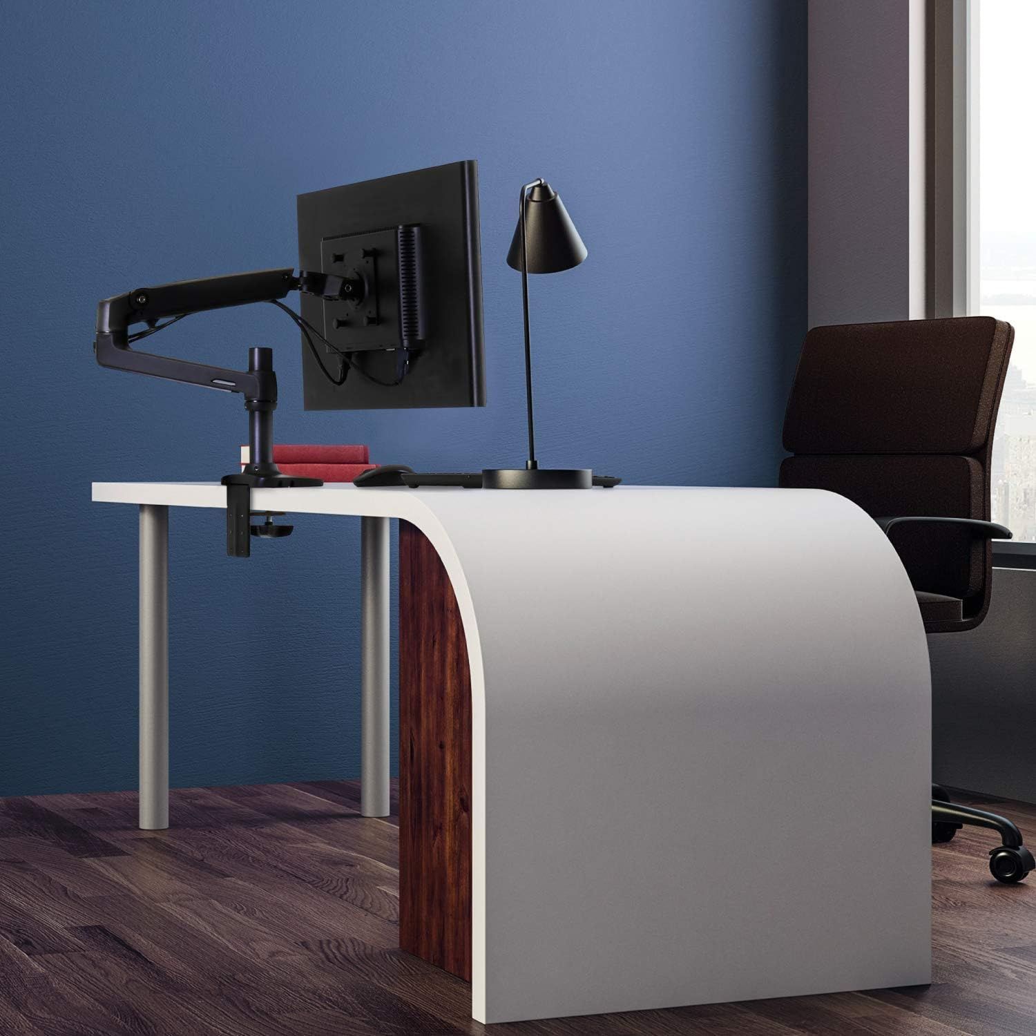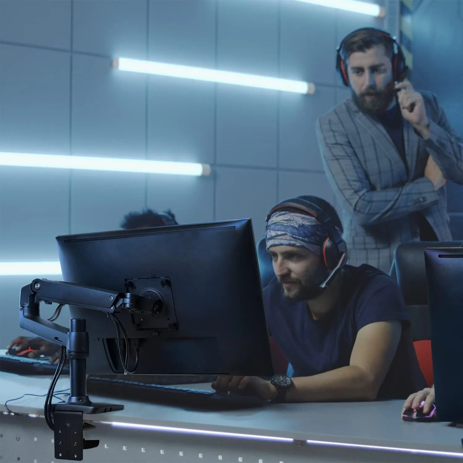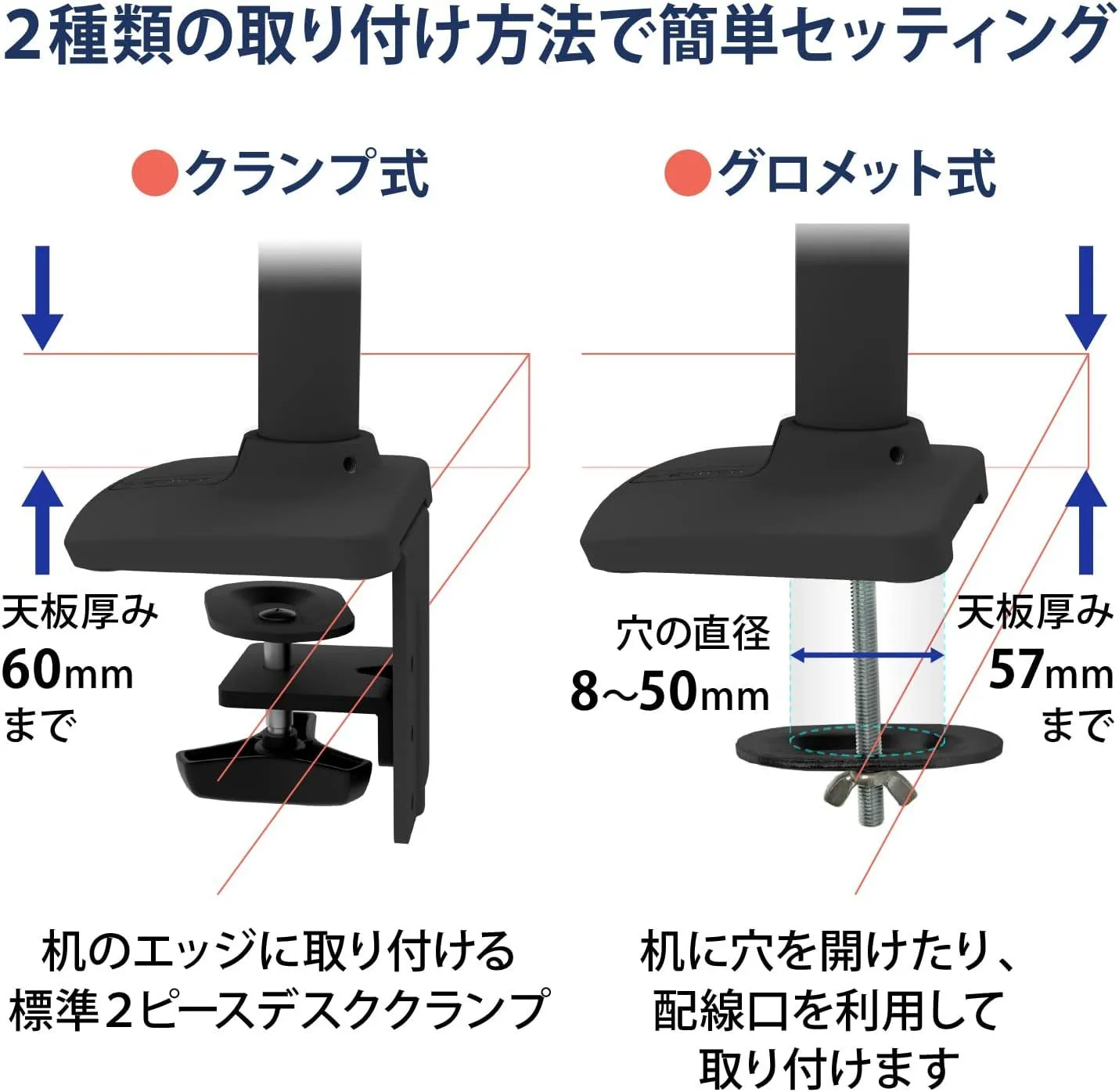 デスクマウントタイプで、モニター位置を自由に調整でき、作業環境の改善や省スペース化に適しています。