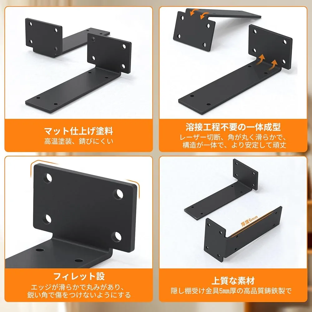 【優れた素材】Xpang 隠し棚受け金具 5mm厚の高品質鋳鉄製で、一体成型、非溶接構造です。より特別な外観のためのマットな鉄仕上げが特徴です。錆や耐腐食性の表面のための高温黒色粉末コーティング技術で作られています。室外で使用しても錆が付きにくいです。