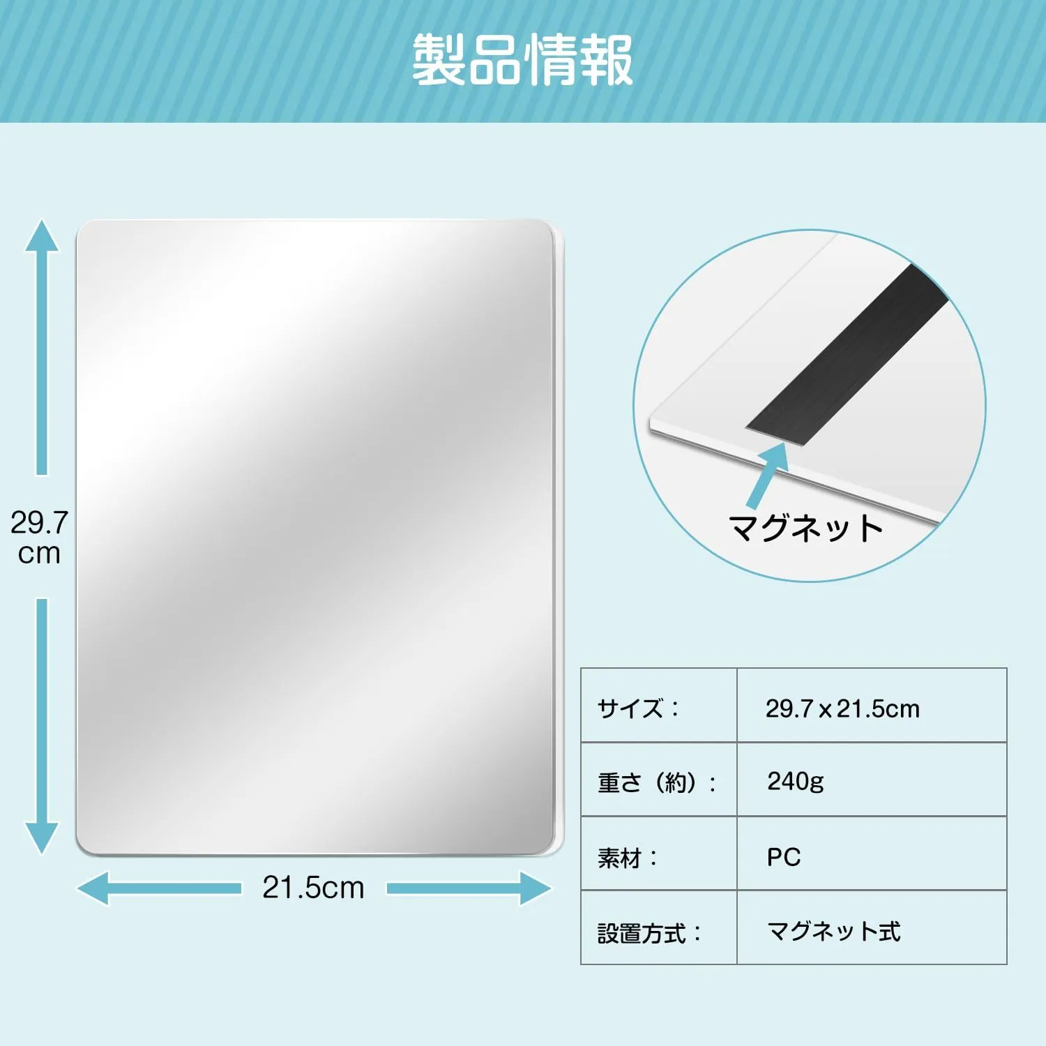 【軽量、どこでも設置OK】当社の1枚鏡は重さが240g。非常に軽量で、ガラスミラーの半分重さです。誰でも簡単に設置できます。壁に取り付けるため、スペースを有効に活用できます。樹脂鋼板を使用した浴室壁面、マンションなとの玄関鉄扉、口ツ力一、冷蔵庫、洗濯機などの金属塗装面などに設置OK。