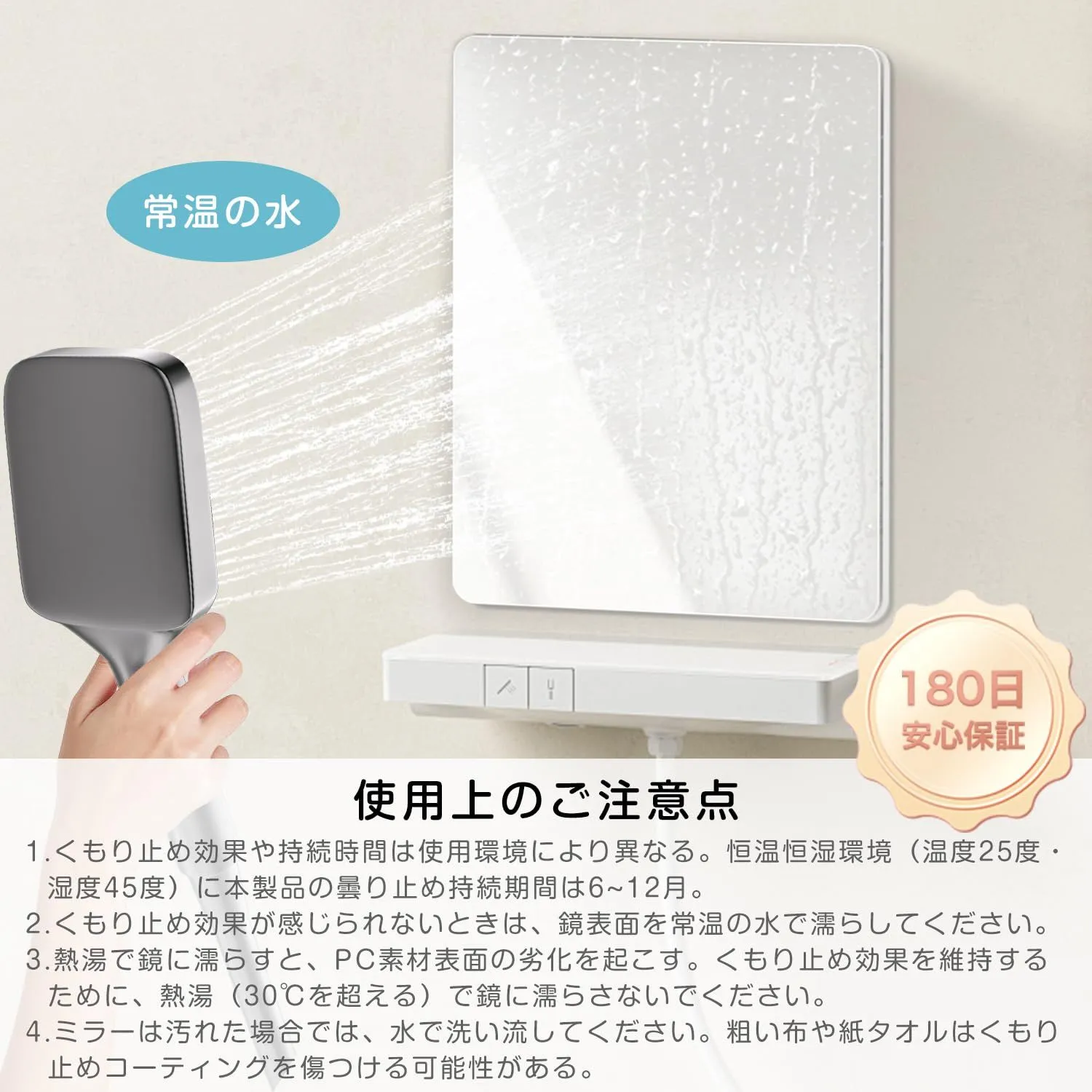 【お手入れのご注意点】①鏡が汚れると、曇り止め効果が低下する。汚れのお手入れは、水で軽く洗い流してください。風通しが良い場所に置いて干してください。②直射日光に当てる高温なところを避けてください。歪みの原因となる。③雑巾、粗い布や紙タオルで鏡表面を拭っていないでください。曇り止めコーティングを傷つける可能性がある。④石けん、中性洗剤、ベンジン、シンナーなどの有機溶剤を使用しないでください。曇り止めコーティングの損傷・表面の変質・?色及ひ鏡の腐食の原因になる。⑤研磨剤付のナイロンたわし、クレンザーなどで洗わないでください。