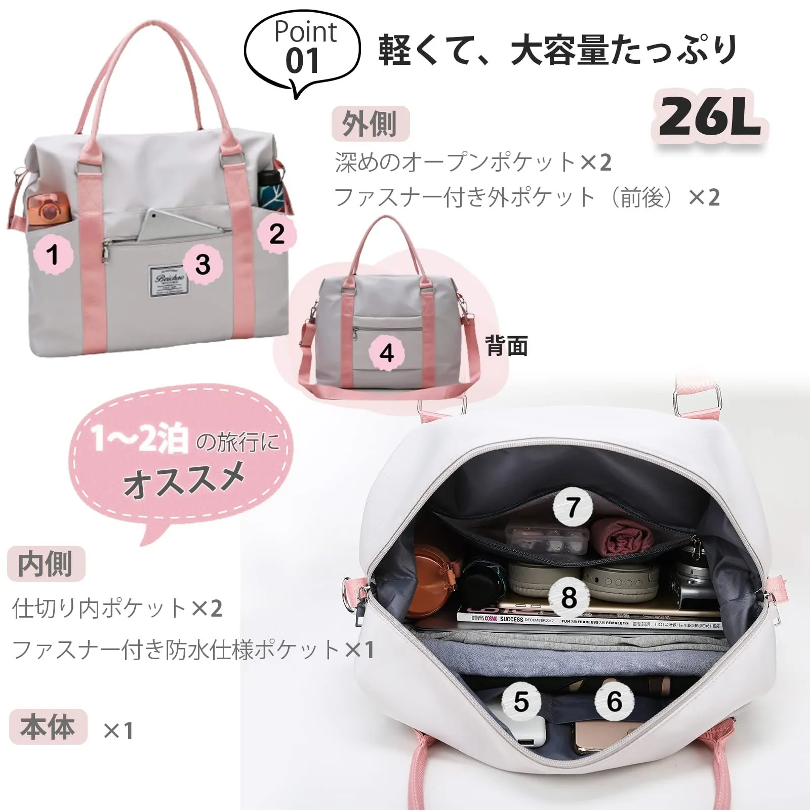 【たっぷり26L 大容量の収納力】1泊~2泊の旅行や出張、ジム通い、スポーツ用、入院用バッグにオススメの大容量ボストンバッグ。大容量なのに超軽量650g、荷物が増える旅先での心強い味方。