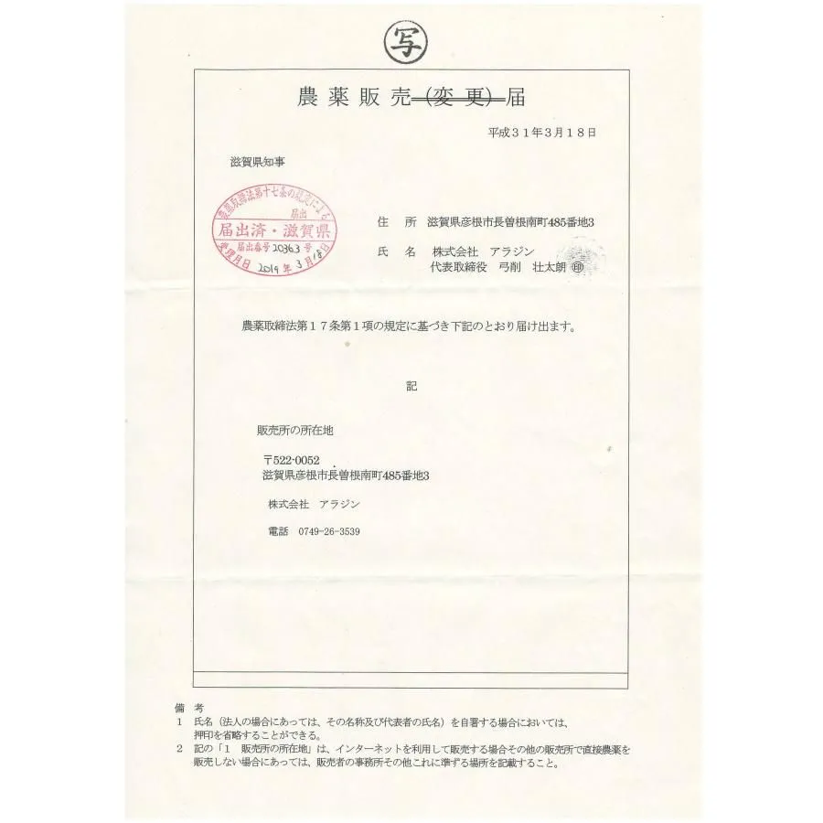 当店は農薬販売届け出済みで販売許可を得ております。