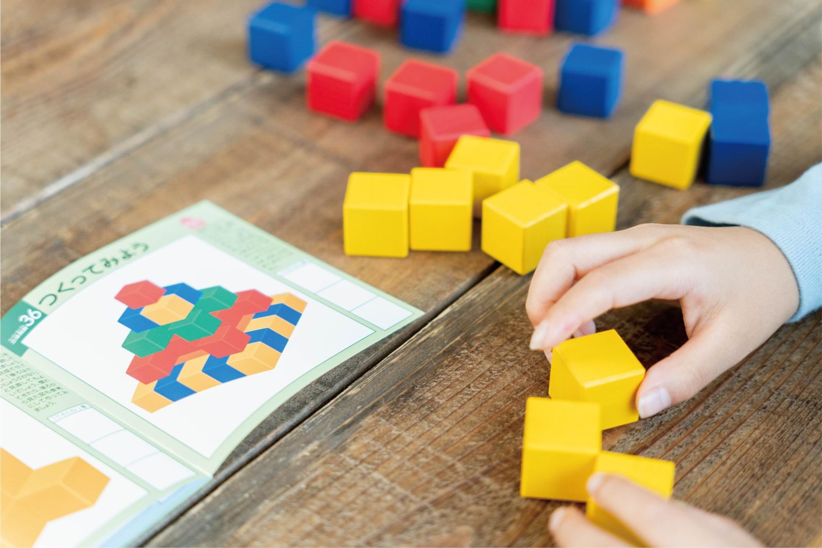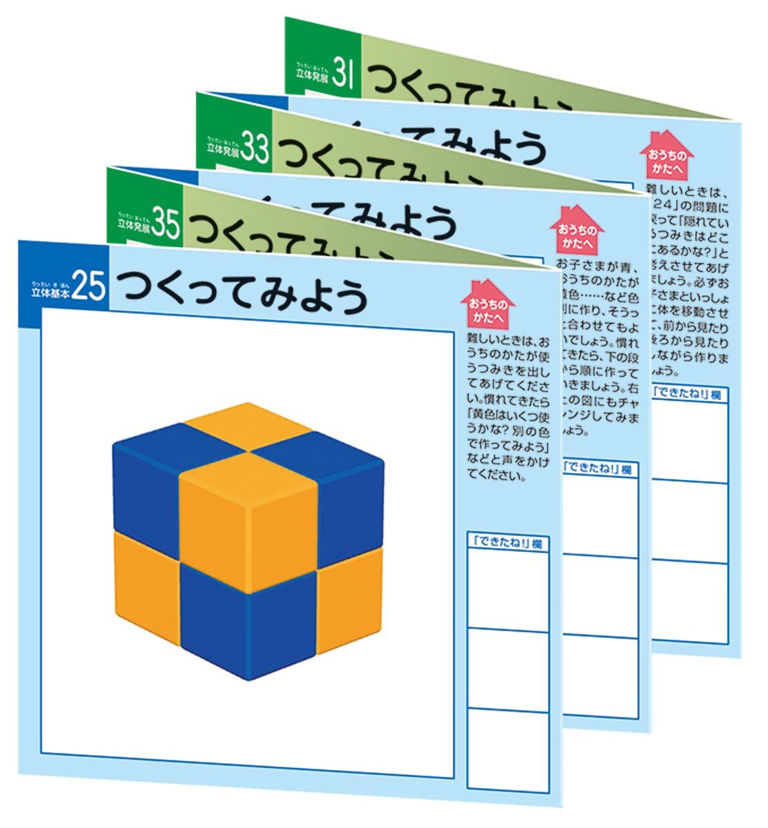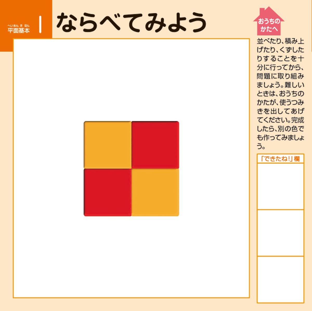 【特徴】 平面・立体図形の構成力を育てる! つみきを並べて、パターン問題と同じ図形を作ります。パターン問題を番号順にすすめましょう。平面から立体まで少しずつステップアップして、図形の位置・構成の感覚を育てます。 洞察力・推察力を育てる! パターン問題に描かれていない図形の裏側などは、推察して作ってみましょう。