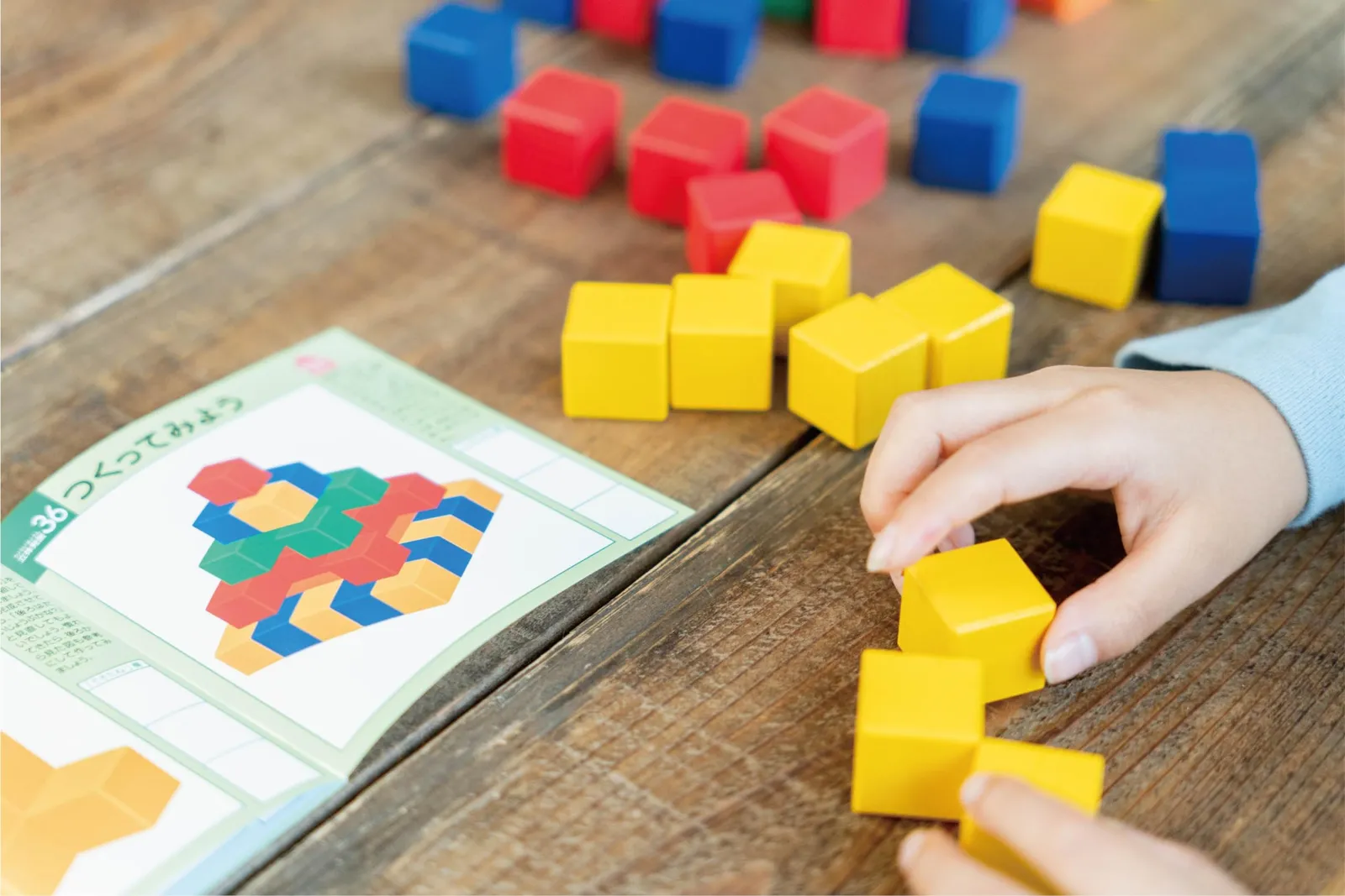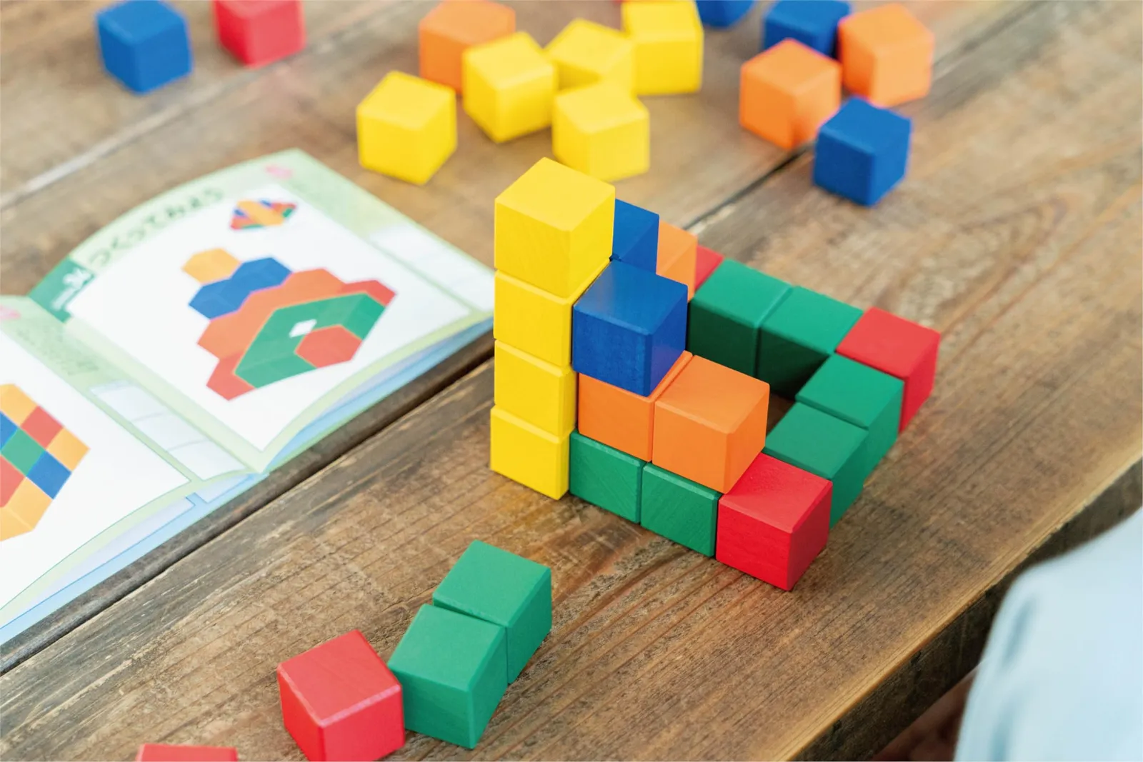 カラフルな立方体のつみきで創造性を高める玩具です。付属のパターンカードどおりに並べたり、積み上げたりして、遊びながら図形感覚を育て、形の構成力を身につけます。