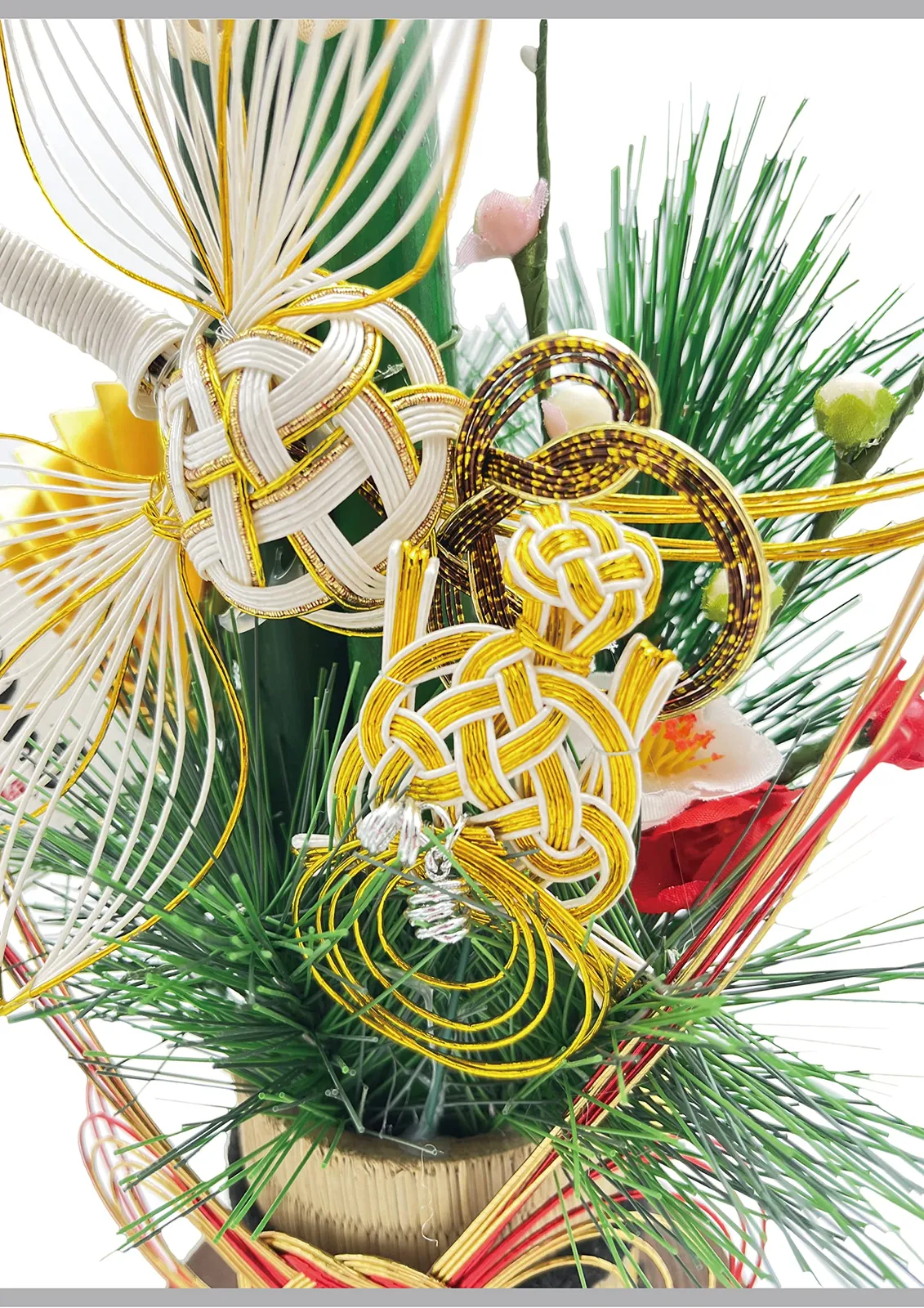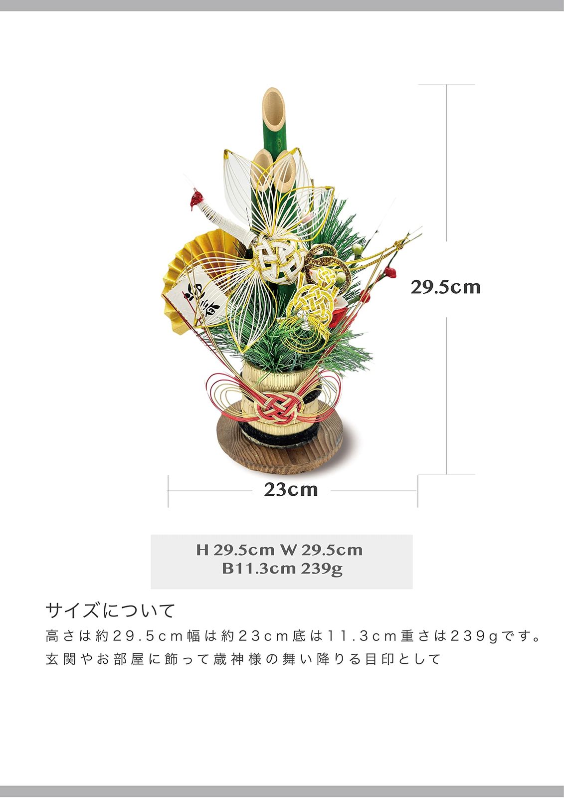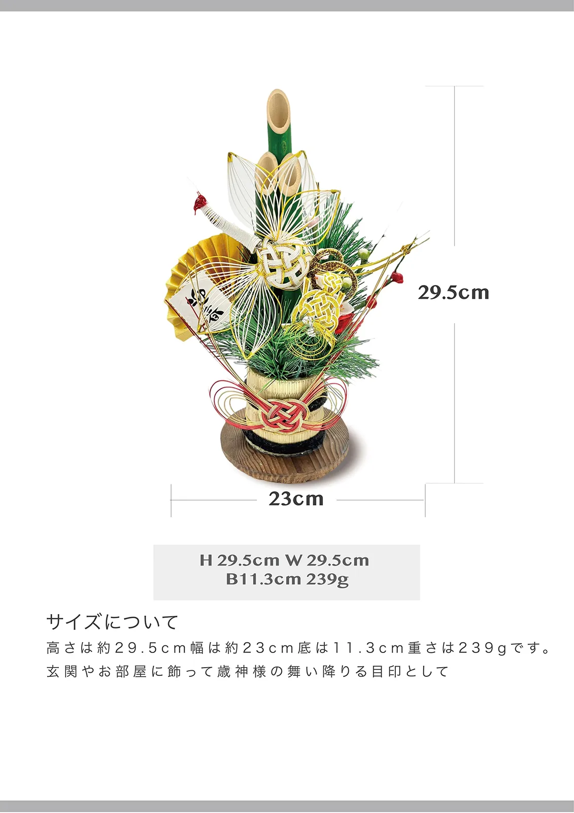 新しい年を幸福で実り大きい年でありますよう、心を込めて作り上げました。お正月飾りは古い不浄を払い、一年間家族を守って頂ける[年神様(歳神様)]を迎える為の物であり、また、家内安全・交通安全・商売繁盛を祈願する意味も込められています。本来は、松の内がすぎましたら燃やすのが習わしですが、環境問題等の配慮からお住いの各地方自治体の指示に従って処分してください。