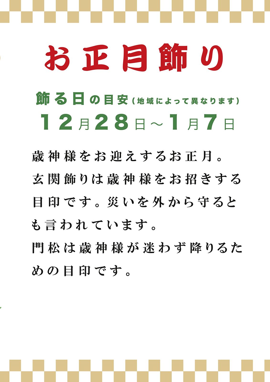 意味:新しい年の神様をお迎えのため、玄関先などに飾る「お正月飾り」。「神様をまつるのにふさわしい神聖な場所であること」を示す大切な意味を持ちます。お正月飾りをかけることでその内側が清らかな場所となり、魔よけの意味もあるため、家では玄関に飾るのが一般的とされています。地域やしめ飾りの形によっても異なりますが、神棚や水回りに飾ることもあるようです。