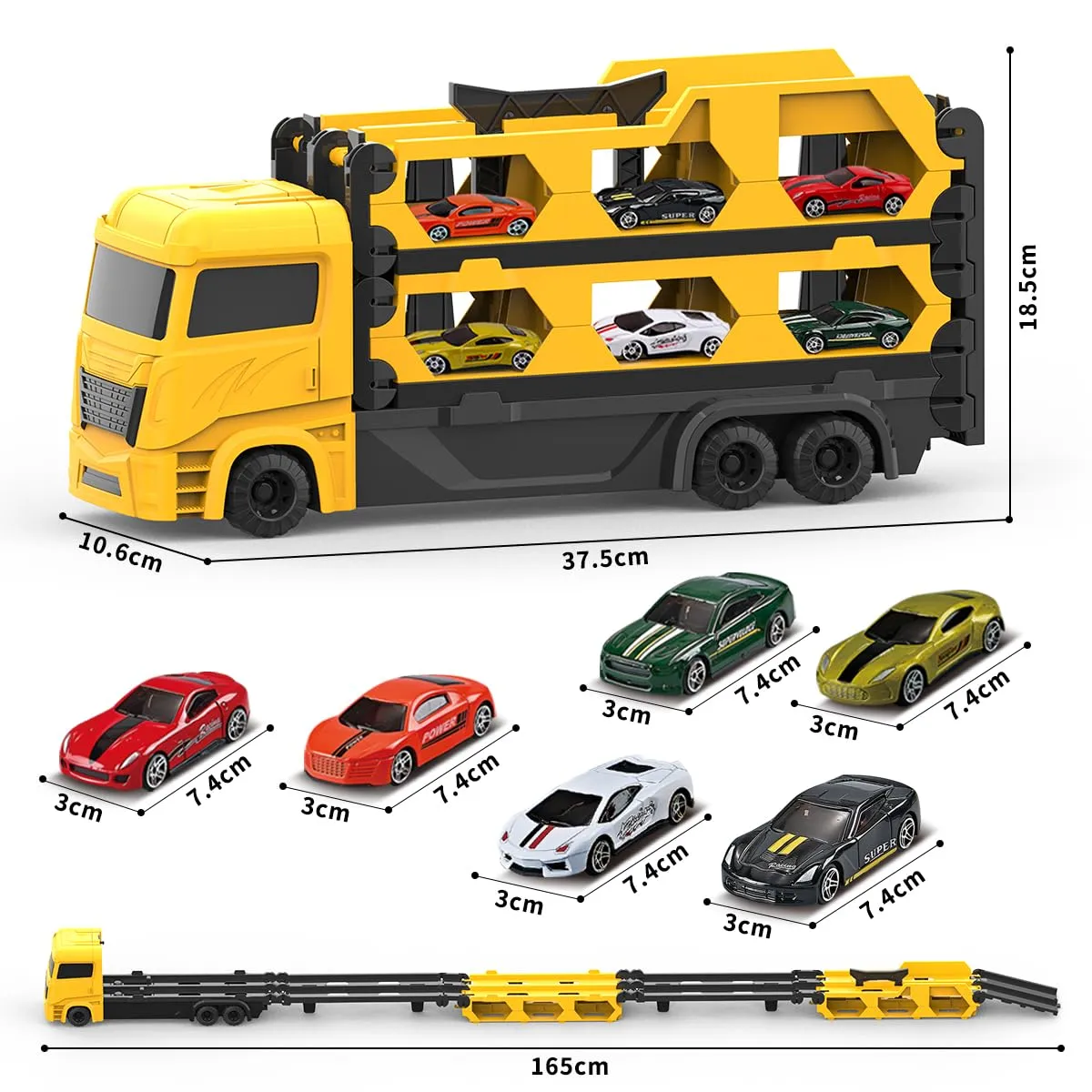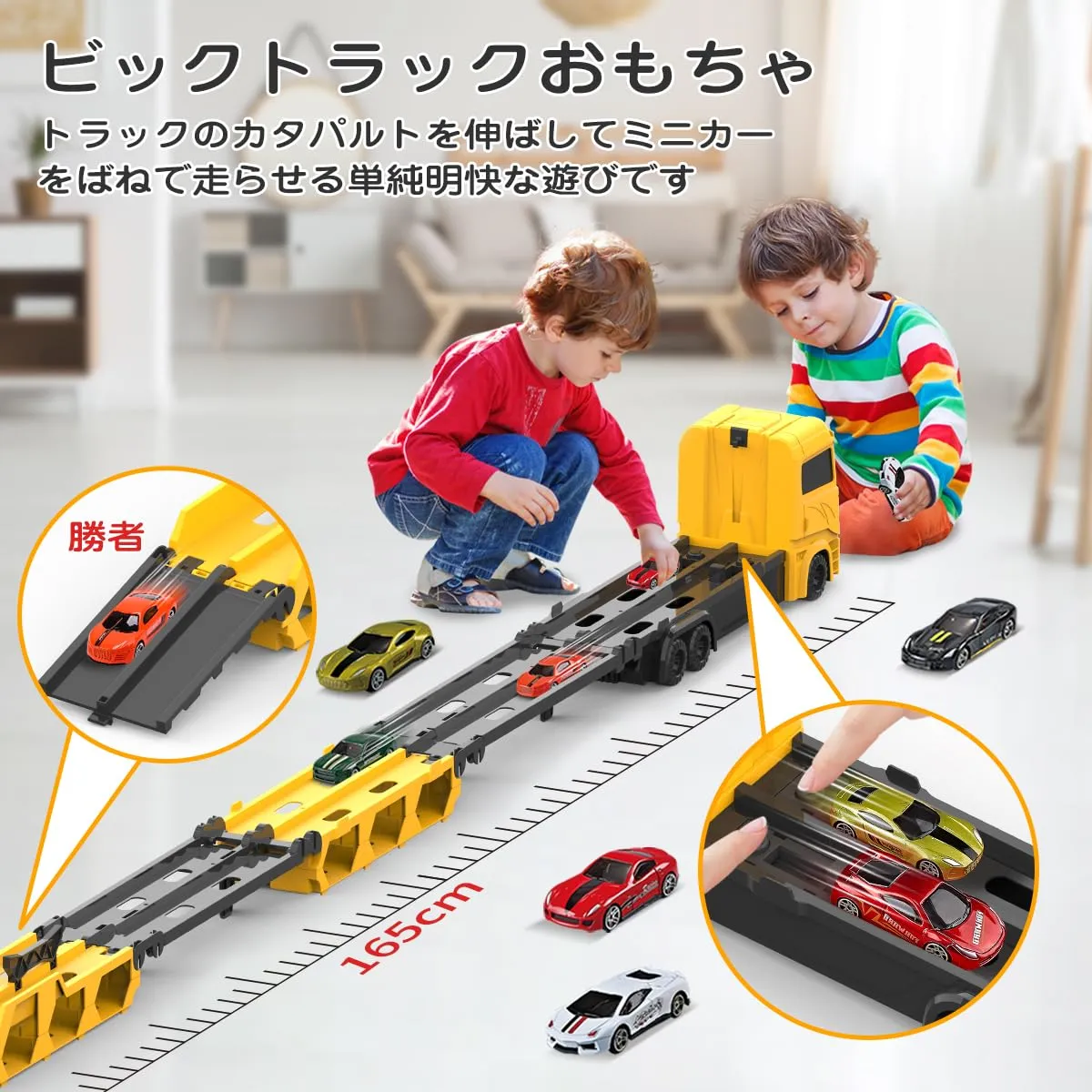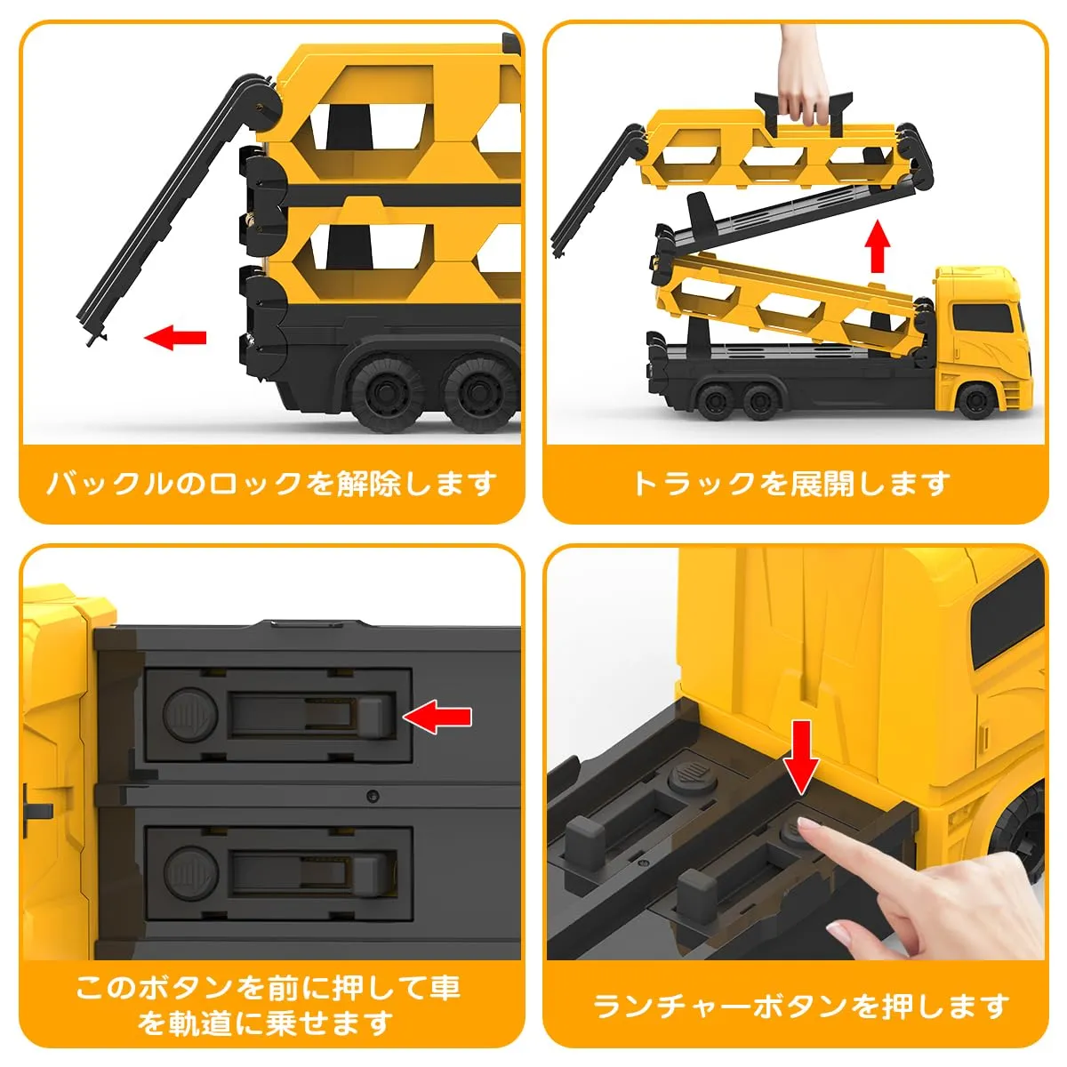 【折りたたみ部分】:輸送トラックのおもちゃには折りたたみ可能なトラックがあり、広げたり折りたたんだりして遊ぶことができ、2つの形状でさまざまな遊び方を提供します。トラックがコースに変更して、競争することができます。レールを伸ばすとレース会場に、たちまち早変わりしました。 ボタンを押して、車を左右に1台ずつセットしまして、よーいスタート!勢いよく飛び出すのでレースは一瞬で終わりますが、 子供たちが楽しそうに遊んでいます♪ 1 安全警告 3歳の子供には向いていない。 最後までご確認頂き誠にありがとうございました。 上記をご確認頂き、ご購入いただけましたら幸いです。 何かご不明な点がございましたらお気軽にメッセージからお問い合わせ下さい。